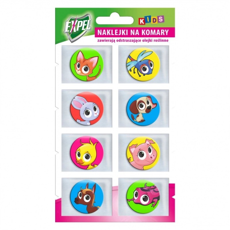 Naklejki Expel nasączono naturalnymi olejkami, które stopniowo uwalniają aromatyczny zapach skutecznie odstraszający komary nawet do 4 godzin. Nalepki są łatwe i wygodne w aplikacji, dzięki czemu będą funkcjonalnym i miłym elementem zabawy dla naszych milusińskich. Sympatyczne zwierzątka będą przyjemnym dodatkiem wózków dziecięcych, moskitier oraz innych elementów w pobliżu dziecka np. łóżeczku, namiocie lub maskotce. Naklejki nie pozostawiają śladów, dlatego mogą być także aplikowane na odzież oraz odsłonięte części ciała, która są zawsze najbardziej narażone na ukąszenia komarów. W komplecie 8 naklejek.