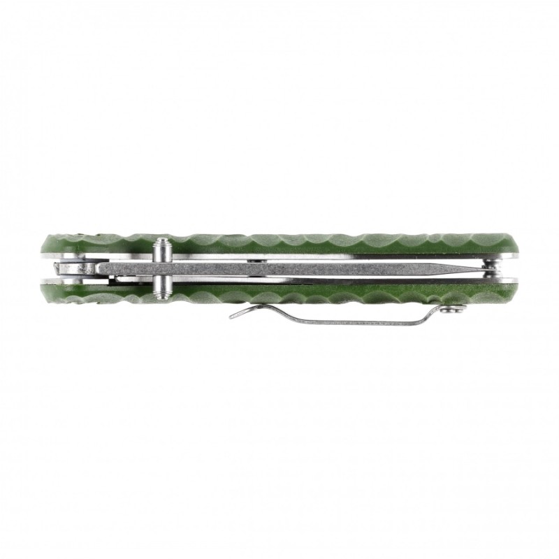 Za wygodne operowanie nożem w głównej mierze odpowiada rękojeść. Ganzo G6252-GR ma profilowane okładziny z tworzywa G-10 mocowane do stalowych wkładek szkieletu śrubami torx. Karbowana tekstura tworzywa oraz ergonomiczny profil rękojeści, sprawiają, że nóż pewnie i wygodnie leży również w mokrej lub zmarzniętej dłoni. Wygodne przenoszenie noża w kieszeni, na pasku lub przy plecaku zapewnia sprężysty stalowy klips (tip up) mocowany po prawej stronie.