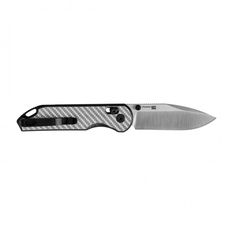 Kizer Assassin ma okładziny będące połączeniem G10 i włókna węglowego o skośnym wzorze. Dzięki temu nóż zyskuje elegancję połączoną z trwałością i pewnym chwytem.