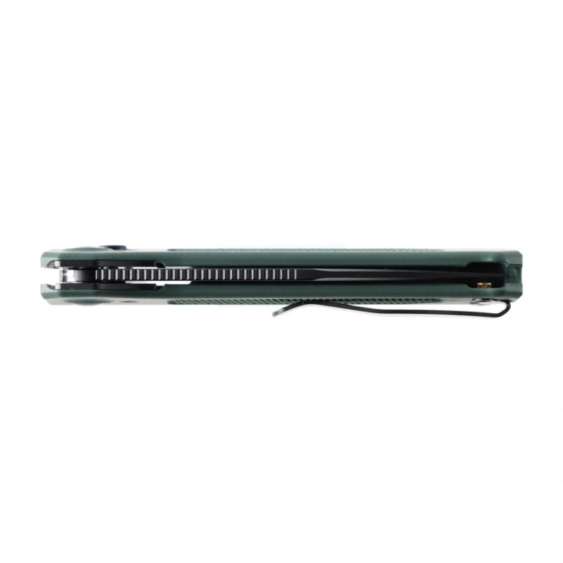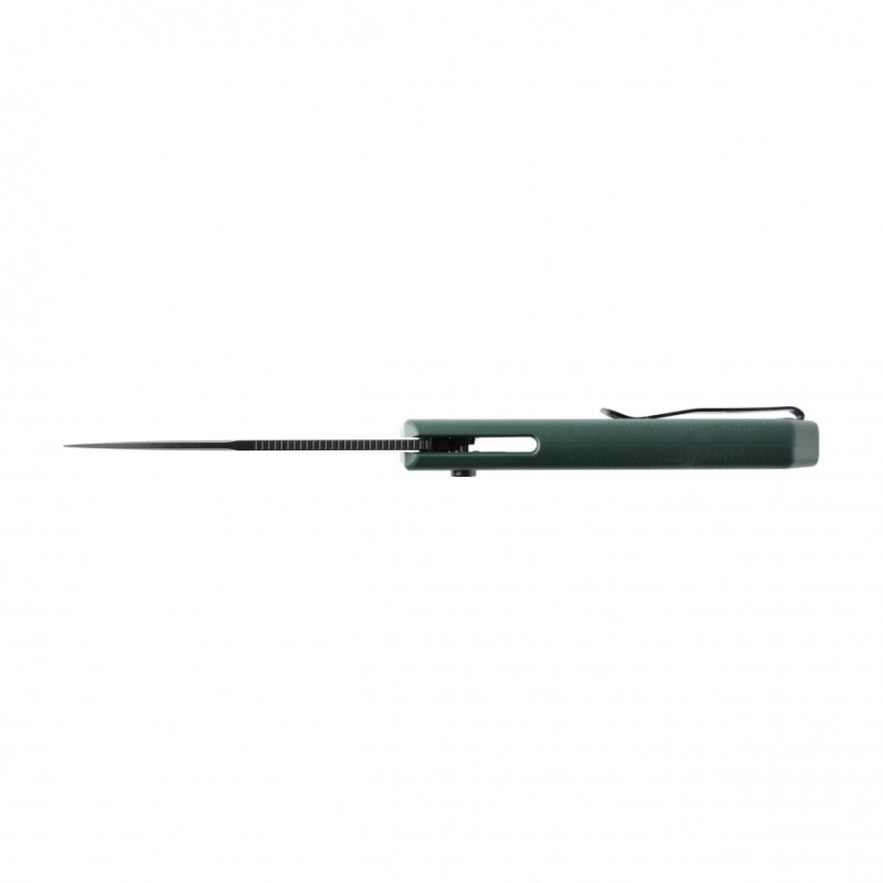 Klingę osadzono na ceramicznych łożyskach kulkowych, dzięki czemu nóż otwiera się płynnie i zapewnia wysoką kulturę pracy. Głownia o uniwersalnym profilu Drop Point została pokryta satynowym wykończeniem chroniącym przed drobnymi ryskami.