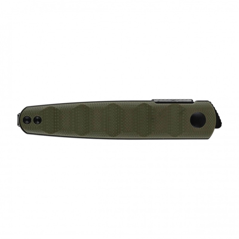 Chwyt noża został wykonany z G10. Materiał ten cechuje się również odpornością na ścieranie oraz brakiem podatności na odkształcenia pod wpływem temperatury. Kompozyt ma antypoślizgową powierzchnię, co gwarantuje pewny chwyt nawet w trudnych warunkach. Unikalna estetyka i możliwość barwienia sprawiają, że rękojeść przykuwa wzrok.