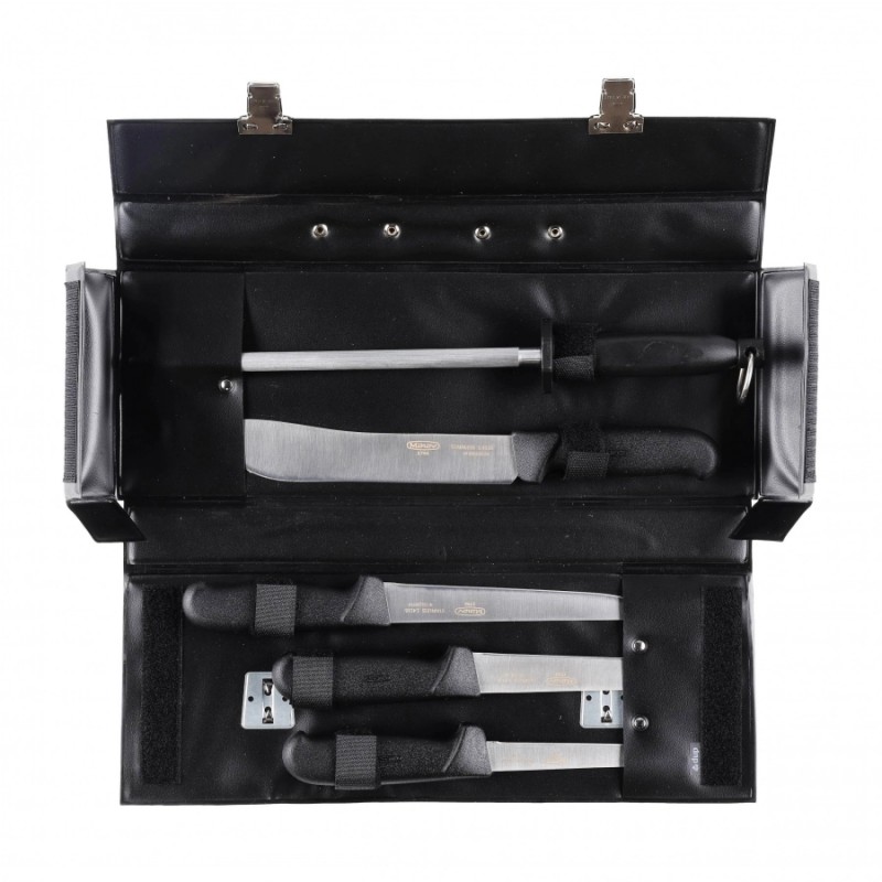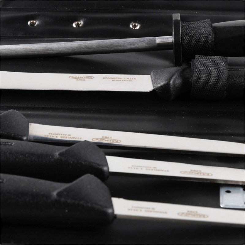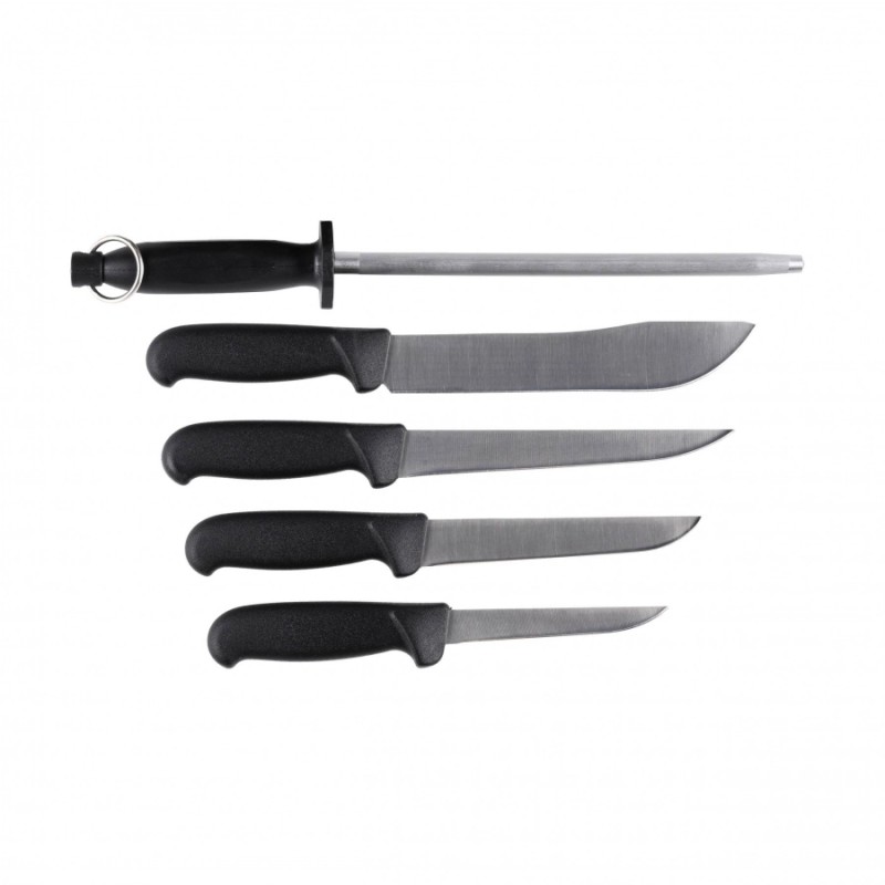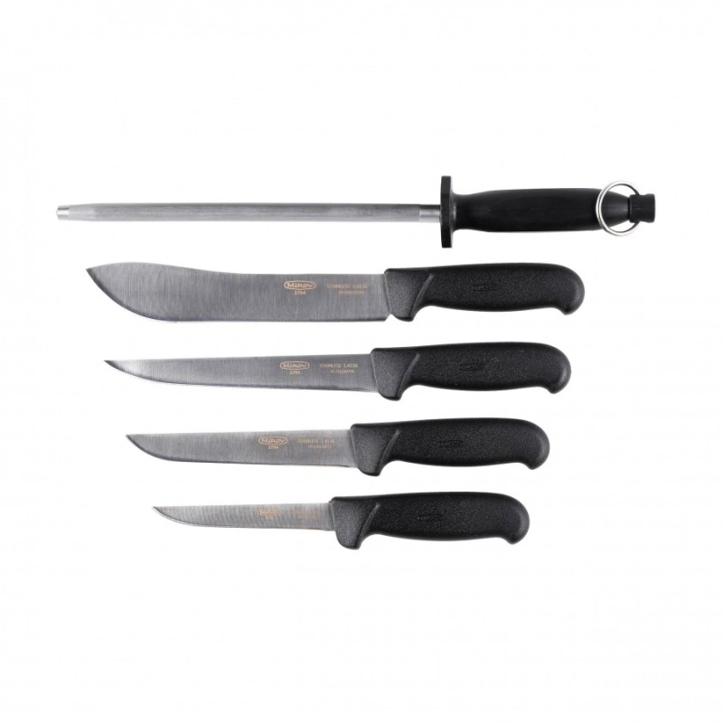 Komplet 4 noży rzeźniczych Mikov 300.005/D zawiera 4 profesjonalne noże masarskie oraz pręt ostrzący, czyli to wszystko, czego nam potrzeba do domowej obróbki mięsa.