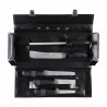 Do wygodnego przenoszenia zestawu służy solidny pokrowiec z tworzywa sztucznego. Etui ma rozkładaną konstrukcję, dlatego po otwarciu etui uzyskujemy wygodny dostęp do wszystkich elementów zestawu. Noże i ostrzałka mają atest do kontaktu z żywnością, zgodny z normami EU.