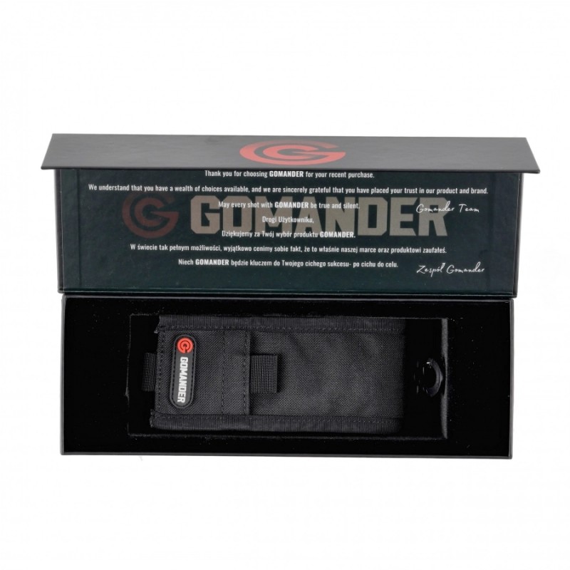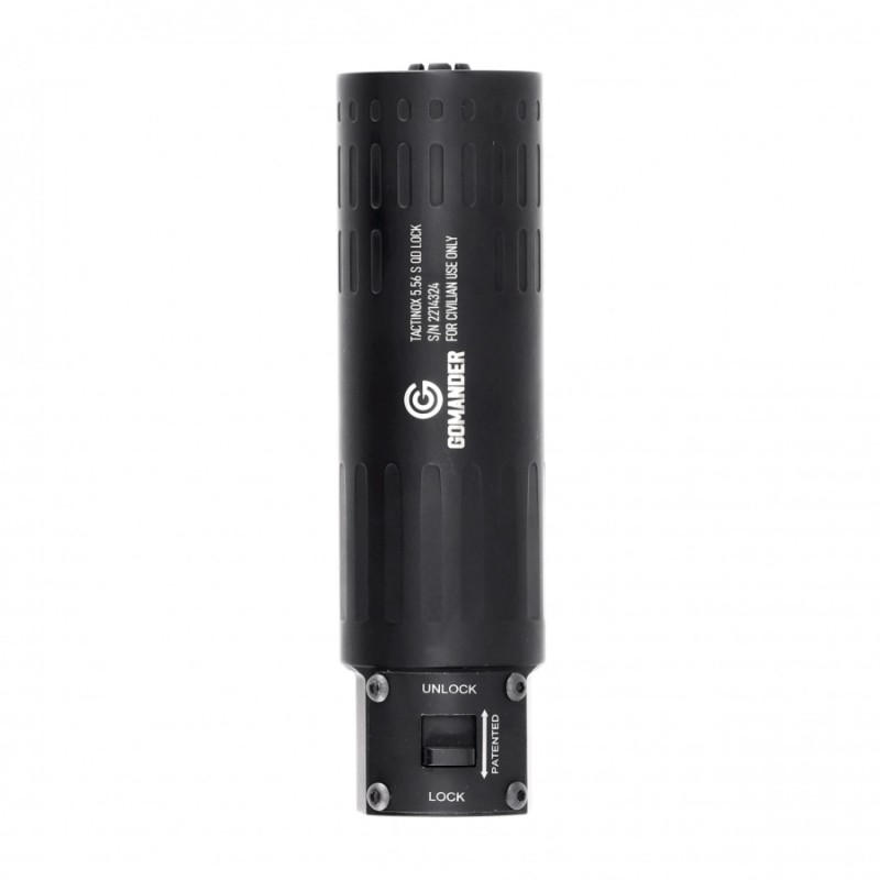 Tłumik Gomander Tactinox w wersji QD Lock oraz kalibrze 5,56 mm to produkt polskiej firmy Gomader, specjalizującej się w precyzyjnej obróbce stali. Model zaprojektowany został do broni kalibru 5,56/.223 Remington i wyróżnia się zaawansowaną technologią Monocore (jednolity rdzeń wewnętrzny), która zapewnia niską masę, kluczową dla wyważenia broni, oraz wyjątkową trwałość. Producent zapewnia, że przez cały okres użytkowania tłumik nie wymaga regulacji ani dokręcania elementów. Model jest w kolorze czarnym i jest na gwint M26x1,5.