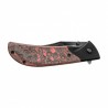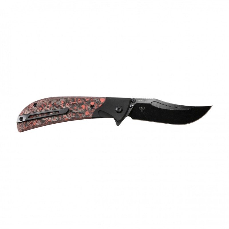Okładziny w nożu Kizer powstały z połączenia lekkiego i wytrzymałego aluminium oraz Fat Carbon o artystycznym wzornictwie symbolizującym płonące pióra i prochy feniksa podczas jego odrodzenia.