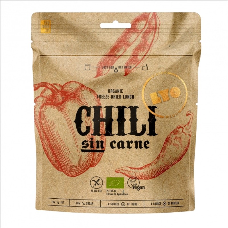 Eko Chili sin carne z polentą 270 g Bistro to wegańska wersja meksykańskiej potrawy chili con carne, o wyrazistym smaku chili i papryki, pełna pożywnej fasoli, oliwek oraz aromatycznych dodatków pochodzących z ekologicznych upraw. To nowa odsłona turystycznych liofilizatów: zdrowsza, ekologiczna i smaczna. Duży nacisk został położony na aspekty ekologiczne.