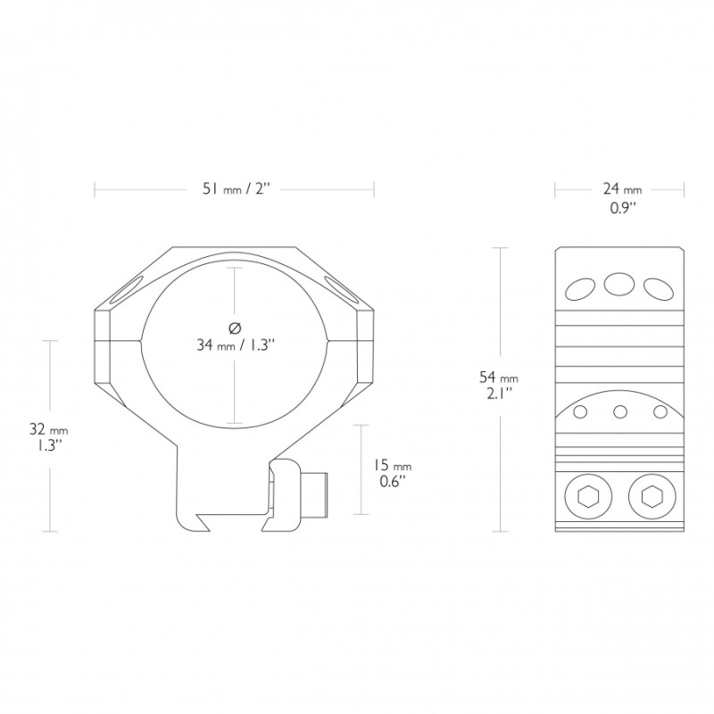 Dwuczęściowy średni montaż Hawke Tactical przeznaczony do lunet o średnicy tubusu wynoszącej 34 mm. Montaż pasuję na szynę Dovetail, na której mocuje się go za pomocą dwóch śrub (każdy z elementów montażu).