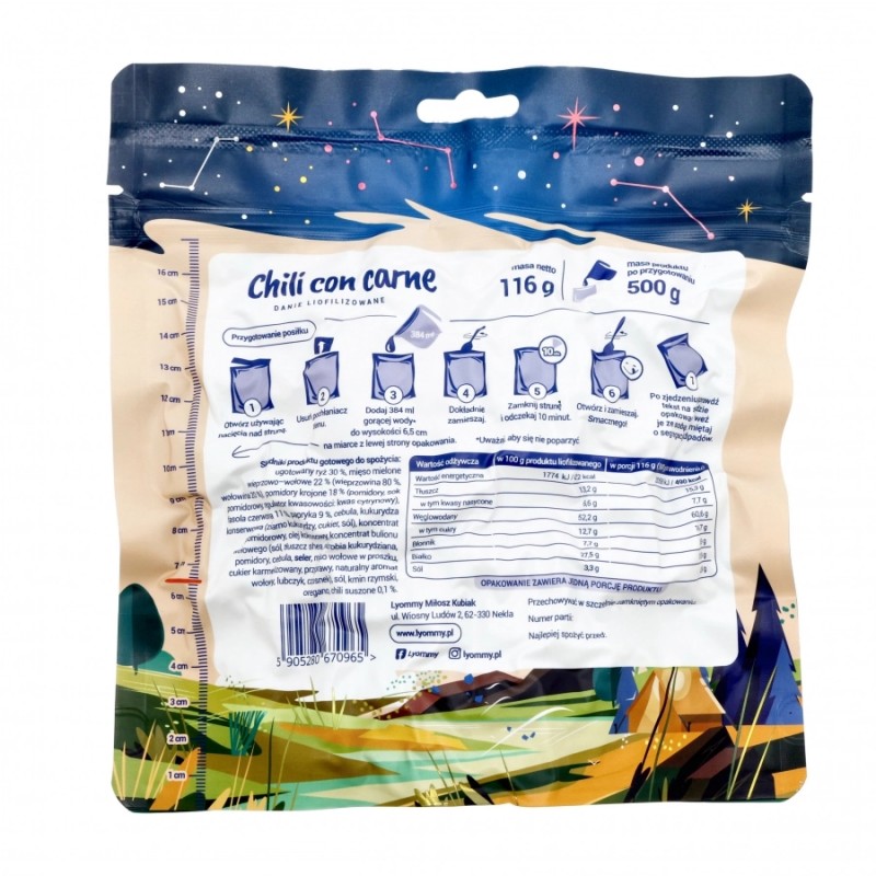 Chili con carne od Lyommy to danie liofilizowane dla miłośników kuchni meksykańskiej i nie tylko. To solidna porcja aromatyczne mięsa mielonego połączonego z czerwoną fasolą, słodką kukurydzą, pomidorami i papryką chili. Kmin rzymski, chili i oregano od razu sprawią, że poczujesz się jak w meksykańskiej restauracji.