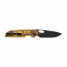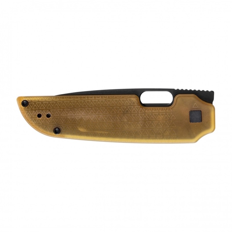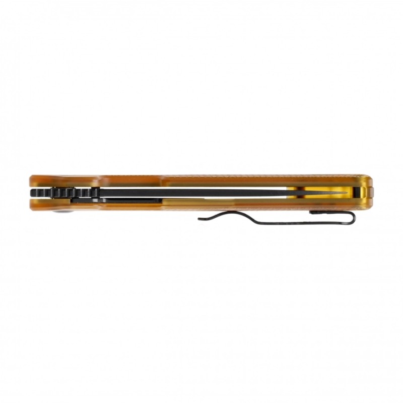 Składany nóż Kizer Varatas wyposażono w żółtą rękojeść zrobioną z tworzywa PEI, odpornego na wysokie temperatury oraz negatywne działanie substancji chemicznych. Materiał ma bursztynową strukturę, dzięki czemu widoczne są wewnętrzne linersy noża, co wywołuje spektakularny efekt. Do okładzin przytwierdzono obustronny klips Deep Carry, dzięki któremu nóż można dyskretnie przenosić w kieszeni spodni.