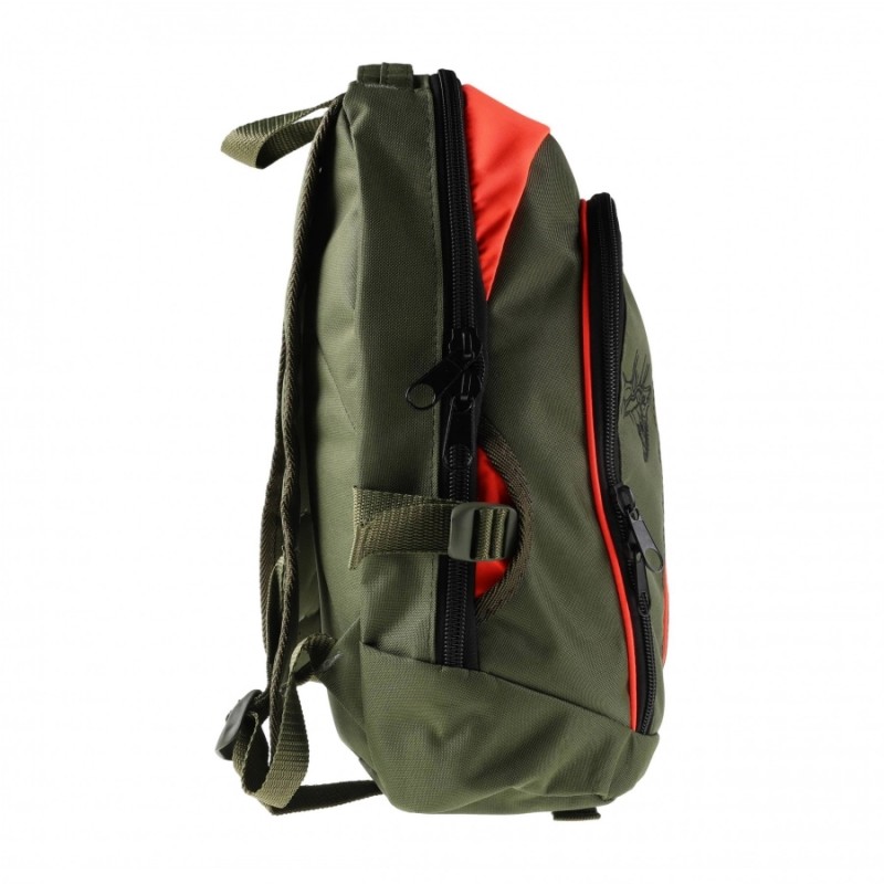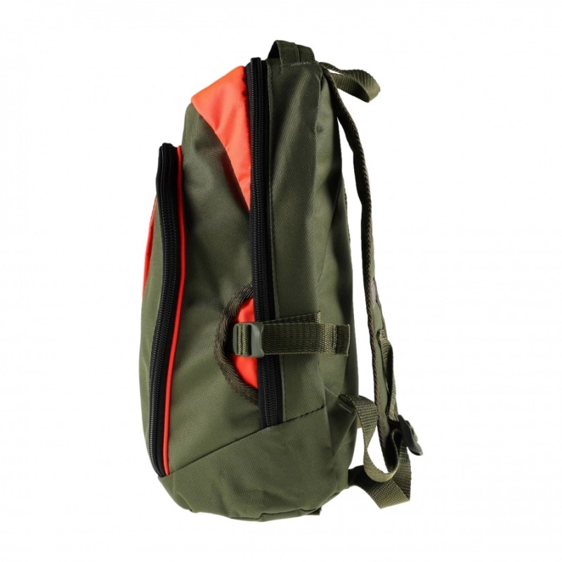Szelki plecaka są regulowane, z łatwością dostosujesz ich długość do swoich potrzeb. Na prawej szelce umieszczono odblaskowy pasek, dzięki czemu jesteś lepiej widoczny w nocy dla współtowarzyszy na polowaniu. Twoją widoczność poprawiają jaskrawo pomarańczowe wstawki. Plecak posiada jedną dużą komorę zapinaną zamkiem błyskawicznym z dwoma wewnętrznymi kieszeniami. Druga kieszeń znajduje się w przedniej części plecaka. Model jest w kolorze oliwkowo-pomarańczowym.