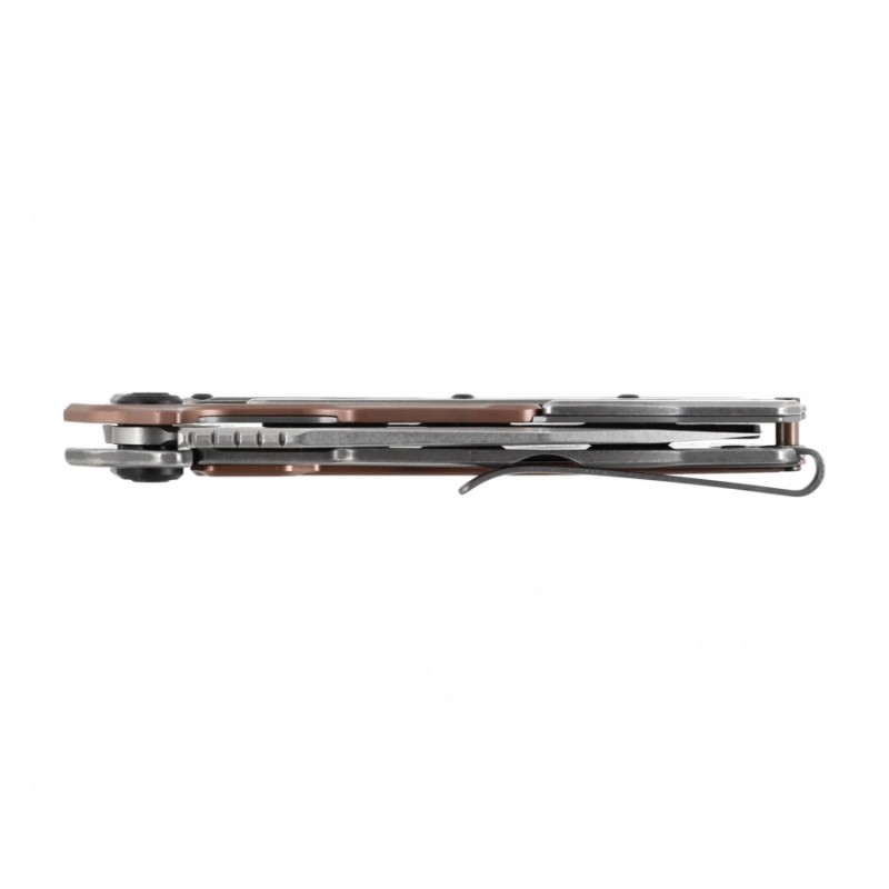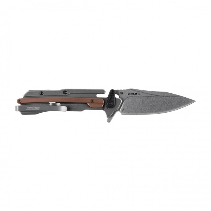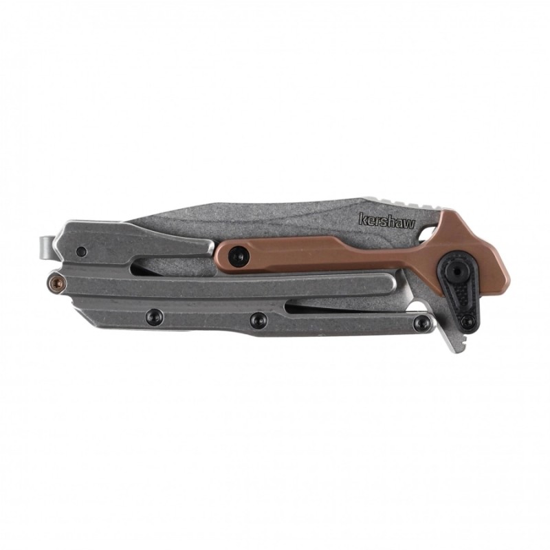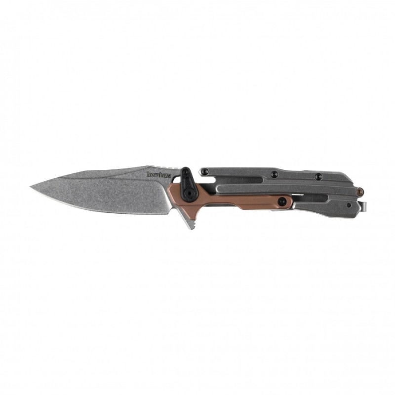 Kershaw Frontrunner to nóż składany o dość intrygującym wglądzie, ale wytrzymały i sprawdzony. Miedzianoszara rękojeść przypominająca kilka połączonych kawałków metalu, odporna na korozję stal D2, klinga typu Clip Point oraz blokada Frame Lock z pewnością zainteresują miłośników zaostrzonej stali.