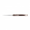 Smukła klinga o agresywnym profilu wharncliffe ma jednolite, matowe wykończenie metodą stonewashed (kąpiel w kamieniach ściernych). Dzięki zastosowaniu wąskiego sztychu, wklęsłego szlifu oraz krawędzi tnącej o niemal prostej linii, nóż ma wspaniałe właściwości tnące, a ostrze nie klinuje się w materiale.