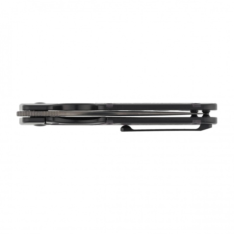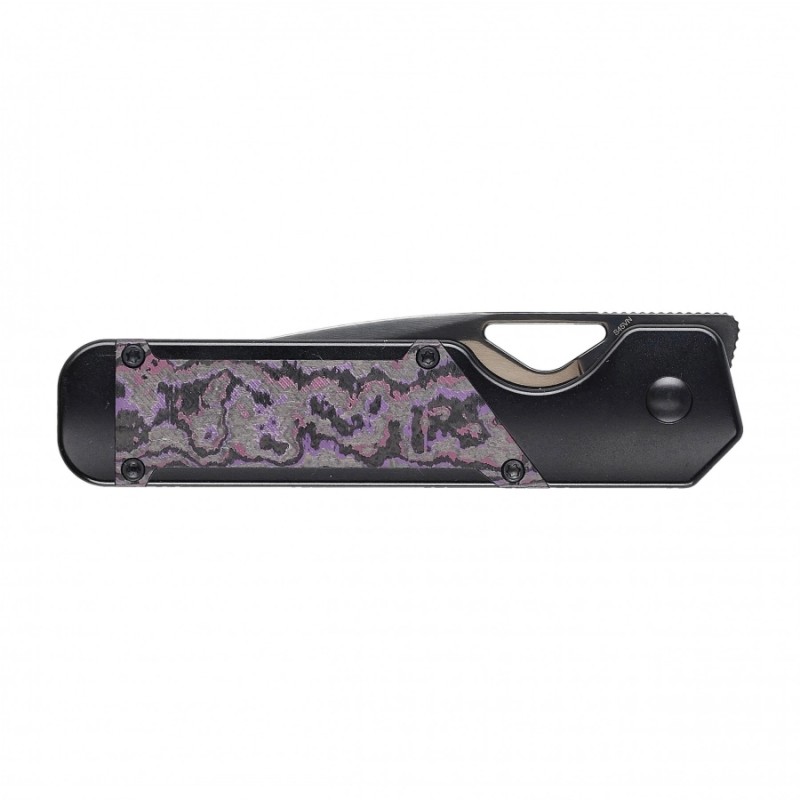 Futurystyczna rękojeść w nożu składanym Militaw powstała z ekstremalnie wytrzymałego, czarnego tytanu połączonego ze wzorzystymi wkładkami Fat Carbon bardzo dobrze komponującymi się z tytanem.