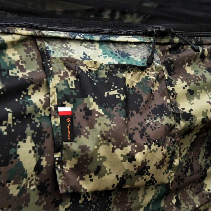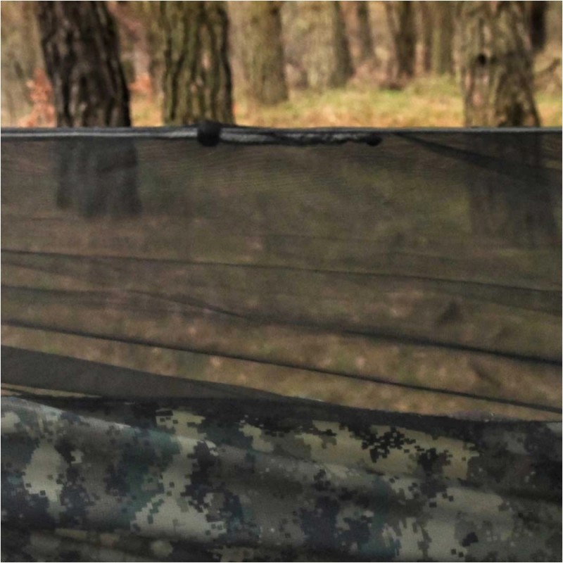 Hamak TigerWood Ważka V2 wykorzystuje wzmocnioną siatką ripstop tkaninę nylonową, gwarantującą te same korzyści wsparte zwiększoną odpornością na uszkodzenia. Materiał charakteryzuje się wysoką odpornością na rozciąganie, dzięki czemu bez problemu utrzyma ciężar do 275 kg. Charakteryzuje się przy tym niską masą oraz dobrą oddychalnością, dzięki czemu będzie komfortowy zarówno w transporcie jak i podczas użytkowania. Umieszczona na boku hamaka kieszonka umożliwi przechowanie pod ręką kluczowych akcesoriów. Zintegrowana moskitiera została natomiast wyposażona w cięciwy, które pozwalają na jej odpowiednie napięcie dla komfortu użytkownika.