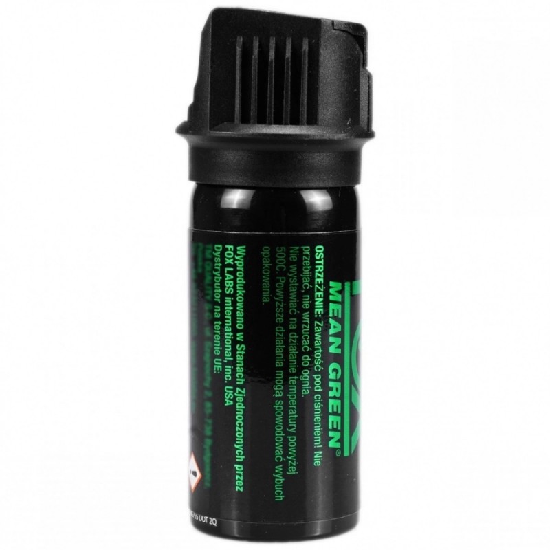 Mocny gaz pieprzowy Fox Labs Mean Green 6% OC 43 ml to niezawodny środek obronny o zasięgu 5 m, który w formie chmury uwalnia 6% roztwór kapsaicyny o ostrości aż 3 mln SHU. Gaz pieprzowy używany w USA przez policję, służbę więzienną i wojsko.