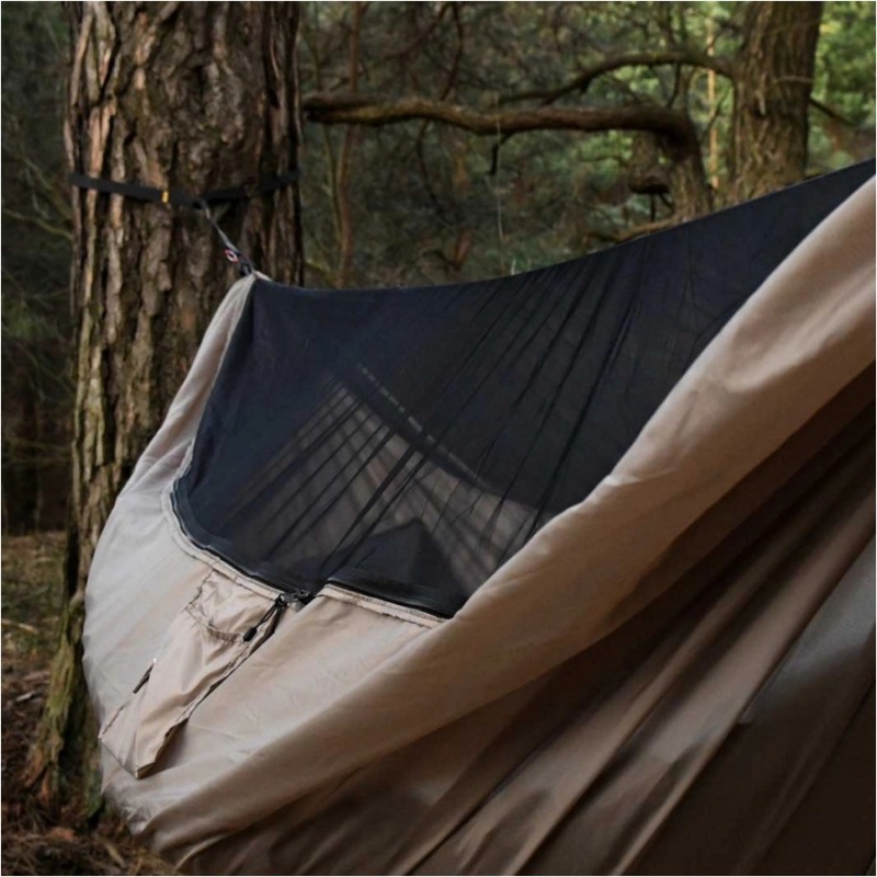 Hamak TigerWood Ważka V2 wykorzystuje wzmocnioną siatką ripstop tkaninę nylonową, gwarantującą te same korzyści wsparte zwiększoną odpornością na uszkodzenia. Materiał charakteryzuje się wysoką odpornością na rozciąganie, dzięki czemu bez problemu utrzyma ciężar do 275 kg. Charakteryzuje się przy tym niską masą oraz dobrą oddychalnością, dzięki czemu będzie komfortowy zarówno w transporcie jak i podczas użytkowania. Umieszczona na boku hamaka kieszonka umożliwi przechowanie pod ręką kluczowych akcesoriów. Zintegrowana moskitiera została natomiast wyposażona w cięciwy, które pozwalają na jej odpowiednie napięcie dla komfortu użytkownika.