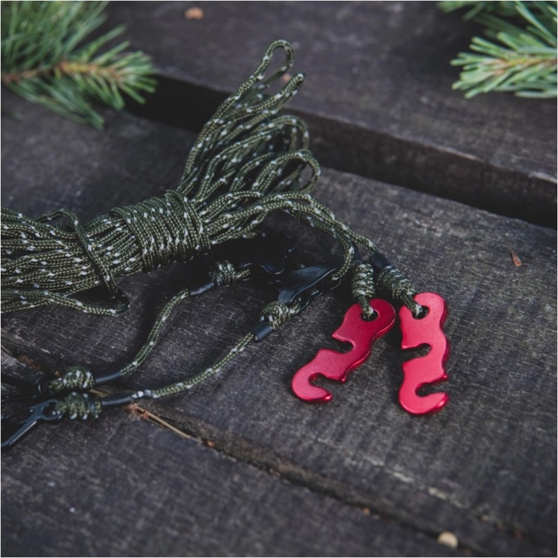 System szybkiego rozwieszania tarpa TigerWood Reflective Silk umożliwią Ci pozbawione użycia jakichkolwiek węzłów rozpięcie płachty biwakowej pomiędzy drzewami. Oparty na niezwykle wytrzymałych oraz niepodatnych na wpływ wilgoci linkach system doskonale sprawdzi się w trudnych warunkach atmosferycznych, gwarantując niezawodność, gdziekolwiek się nie znajdziemy. Dzięki zastosowaniu przesuwnych klamer TigerWood Silk zagwarantuje nam optymalne napięcie tarpa, natomiast 7 metrów linki zagwarantuje możliwość rozpięcia nawet pomiędzy odległymi drzewami.