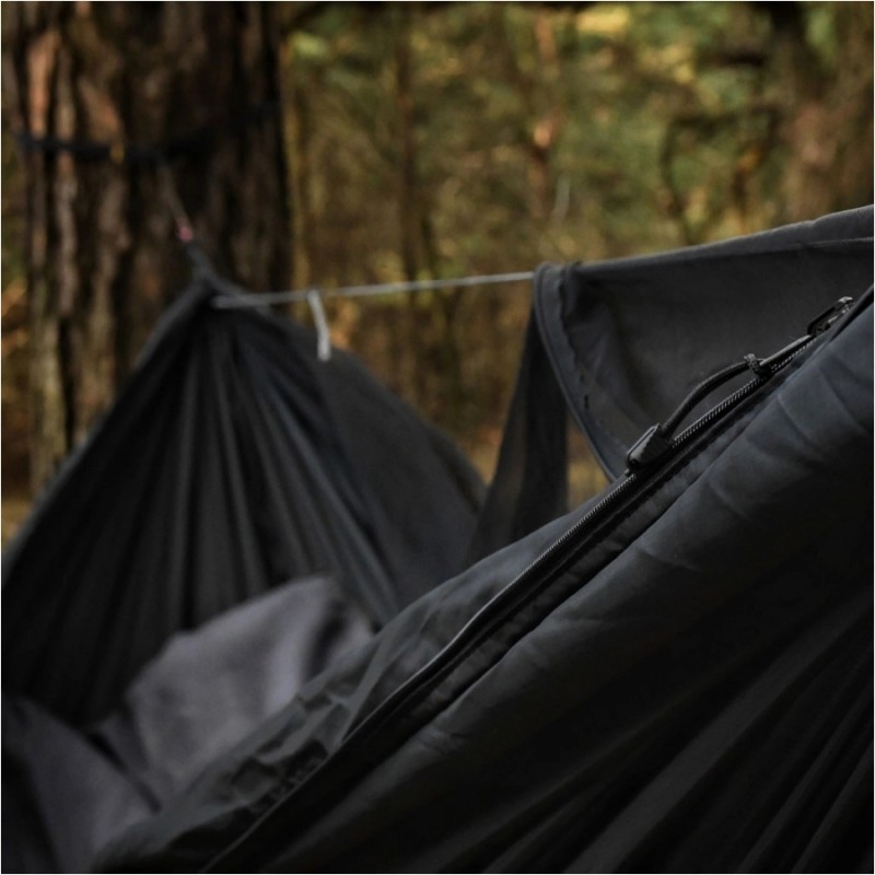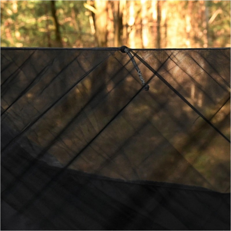 Hamak TigerWood Ważka V2 wykorzystuje wzmocnioną siatką ripstop tkaninę nylonową, gwarantującą te same korzyści wsparte zwiększoną odpornością na uszkodzenia. Materiał charakteryzuje się wysoką odpornością na rozciąganie, dzięki czemu bez problemu utrzyma ciężar do 275 kg. Charakteryzuje się przy tym niską masą oraz dobrą oddychalnością, dzięki czemu będzie komfortowy zarówno w transporcie jak i podczas użytkowania. Umieszczona na boku hamaka kieszonka umożliwi przechowanie pod ręką kluczowych akcesoriów. Zintegrowana moskitiera została natomiast wyposażona w cięciwy, które pozwalają na jej odpowiednie napięcie dla komfortu użytkownika.