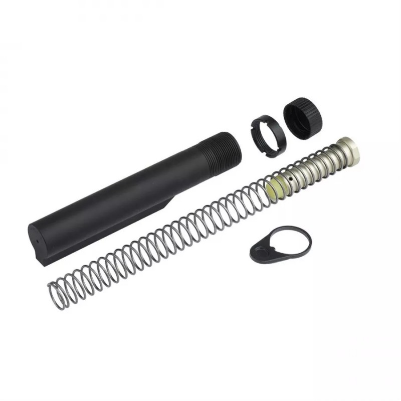 Zestaw zawiera wszystkie niezbędne elementy do montażu: sprężynę, urządzenie powrotne, tylną płytkę oraz nakrętkę prowadnicy kolby. To kompleksowe rozwiązanie sprawia, że montaż i konfiguracja prowadnicy są proste i szybkie.