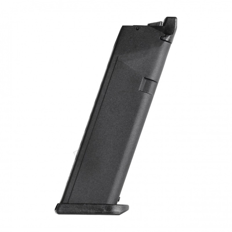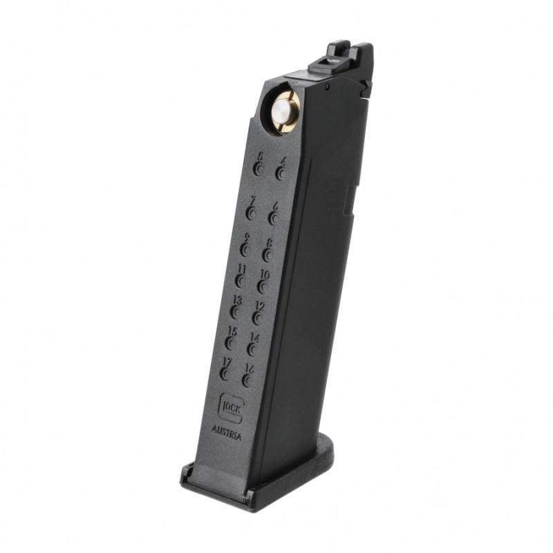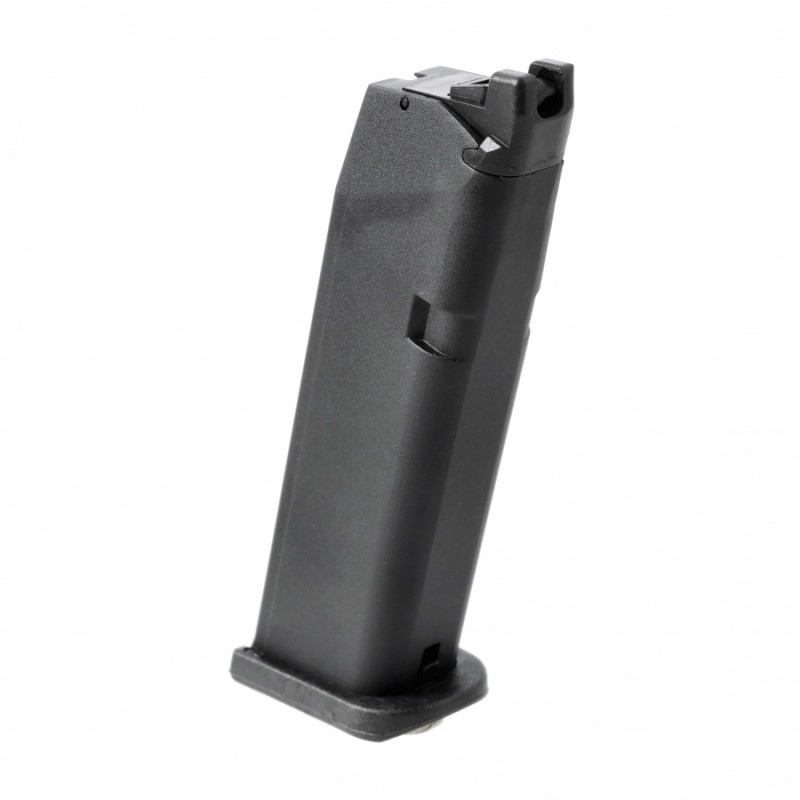 Zapasowy magazynek do repliki pistoletu Glock 17 Gen.5 o pojemności 18 kulek w kalibrze 6 mm. Magazynek jest kompatybilny nie tylko ze wspomnianą repliką ale również innymi replikami modeli ASG Glock. Magazynek wyposażono w ząbkowaną krawędź donośnika, ułatwiającą jego załadowanie. Model jest wykonany z metalu oraz elementów polimerowych. Magazynek jednocześnie jest zbiornikiem na Green-Gas.