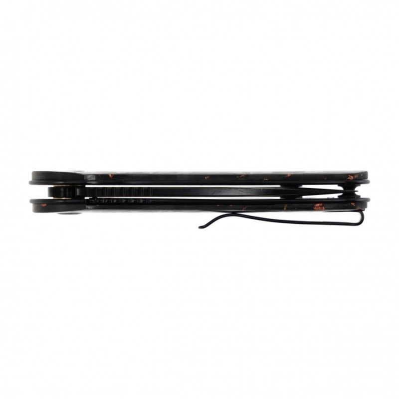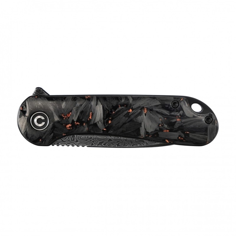 Civivi Elementum posiada rękojeść powstałą z połączenia włókna węglowego z kawałkami miedzi, zatopionymi w przezroczystej żywicy. Mieszanka jest lekka i niepodatna na uszkodzenia mechaniczne.
