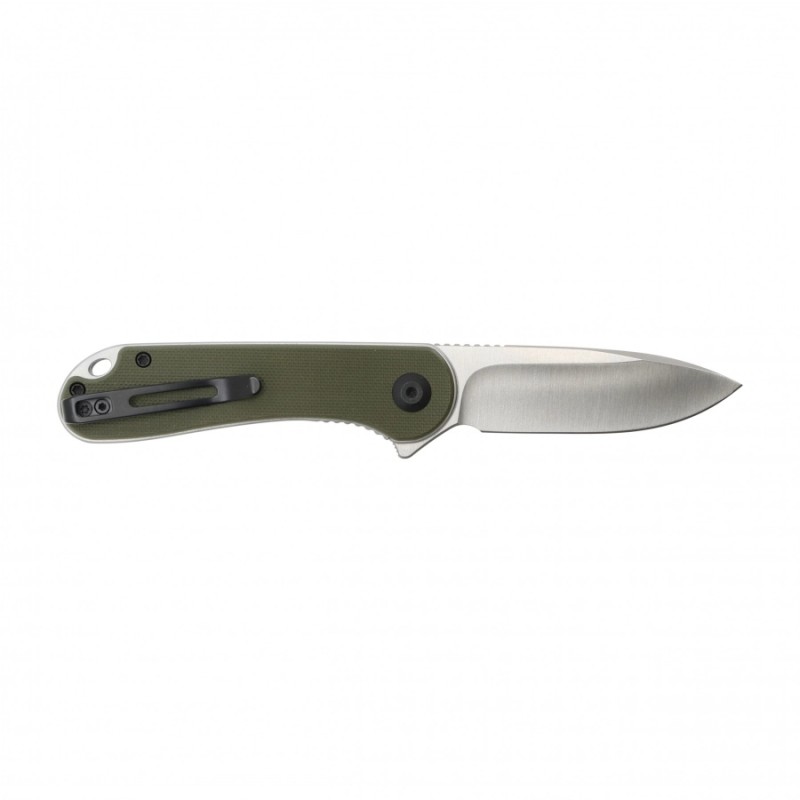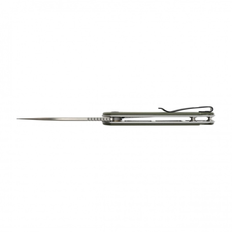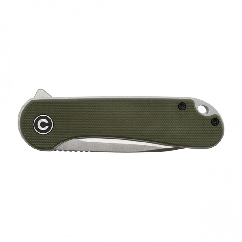 Rękojeść Civivi Elementum wykonano z zabarwionego na zielonego tworzywa G10 – kompozytu z włókna szklanego i syntetycznej żywicy, lekkiego i niepodatnego na uszkodzenia mechaniczne. Chropowata faktura okładzin sprawia, że nóż dobrze leży nawet w spoconej dłoni.