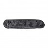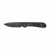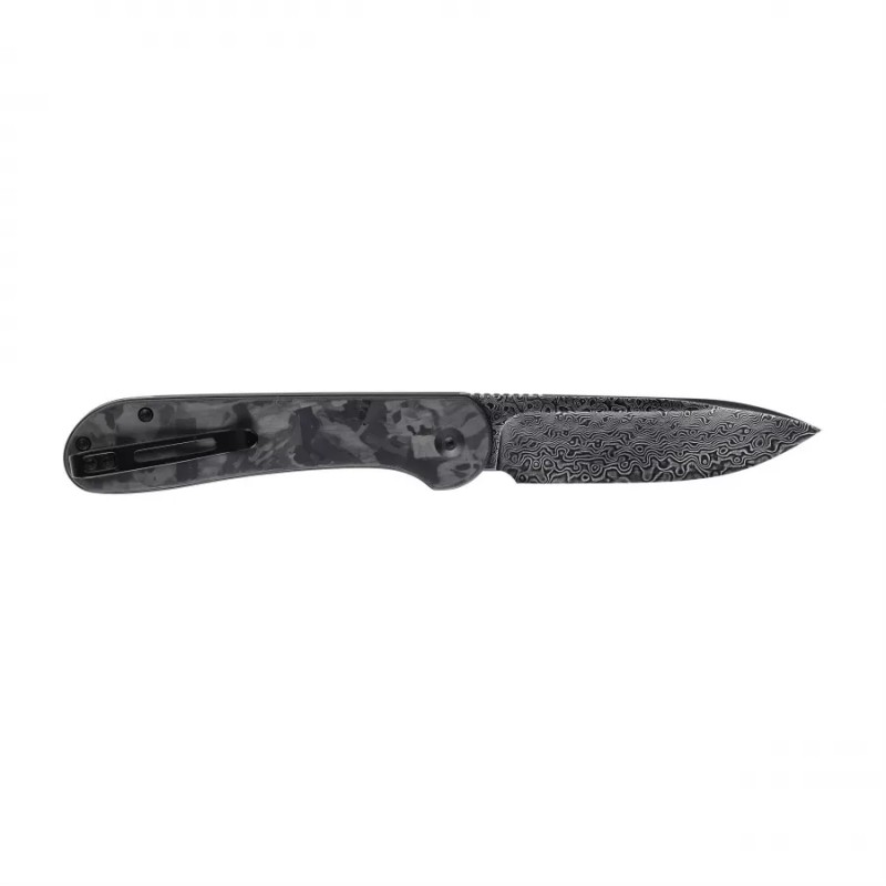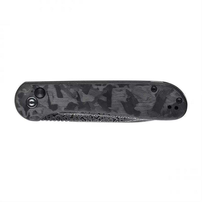 Rękojeść Civivi Elementum wykonano z czarnego włókna węglowego o charakterystycznym marmurkowym wzorze. Kompozyt jest lekki i wytrzymały – nie pęka i nie odkształca się. Chropowata faktura okładzin sprawia, że nóż dobrze leży nawet w spoconej dłoni. Dzięki otwartej konstrukcji (ang. open backed) narzędzie można czyścić i oliwić bez większych problemów.