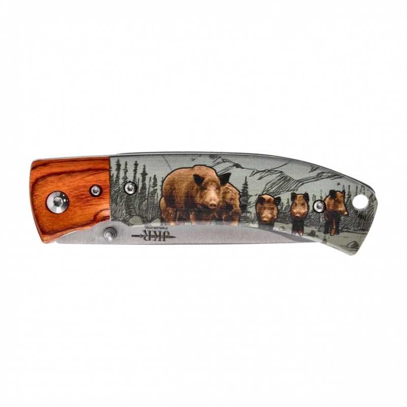 Nóż ma dwuczęsciowe okładziny z drewna oraz anodowanego aluminium lotniczego, które pokryto ozdobną grafiką myśliwską z motywem rodziny dzików.