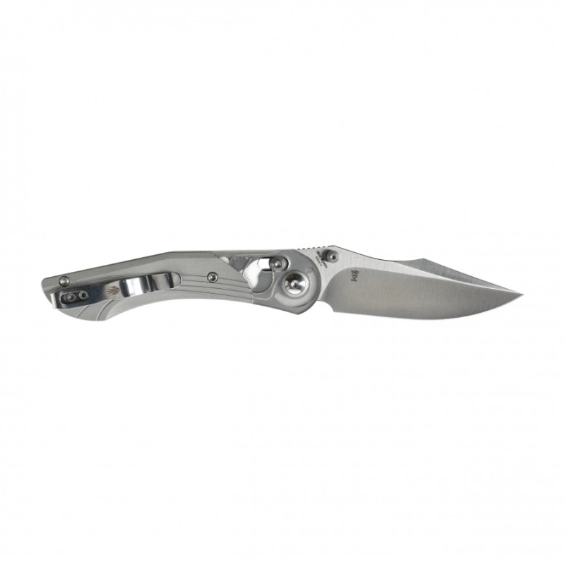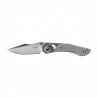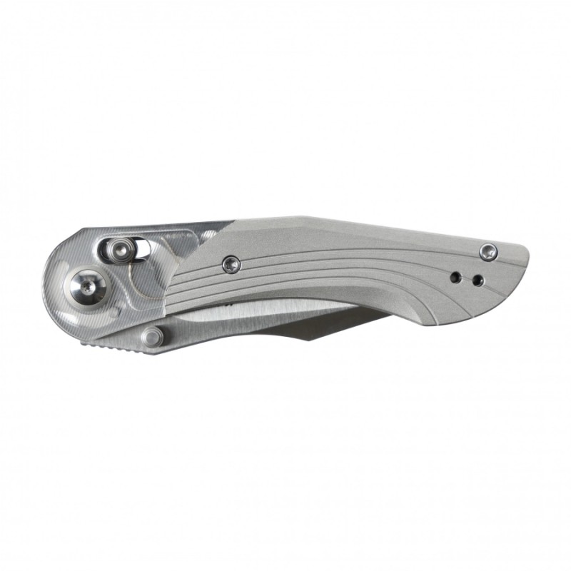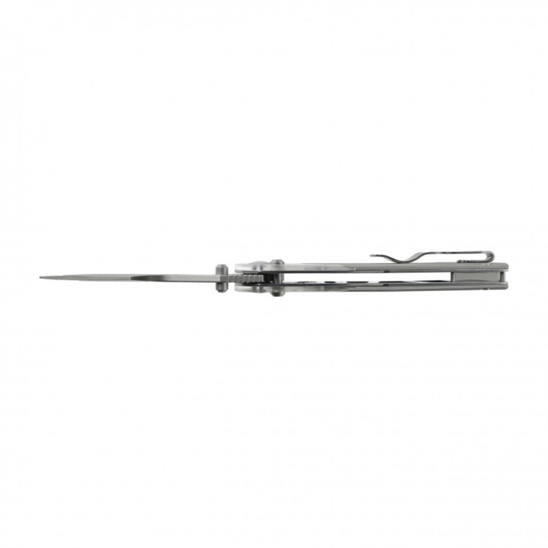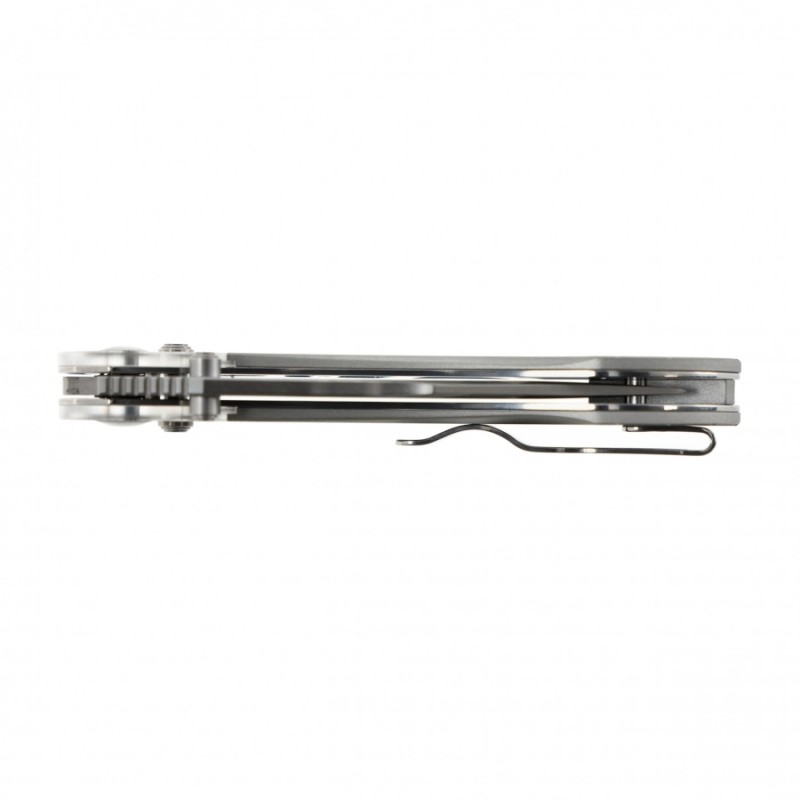 Jednym z najbardziej wyróżniających się elementów Mini Mystic jest nietuzinkowa rękojeść – połączenie przezroczystego akrylowego bolstera z aluminiowymi okładzinami w odcieniu szarości. To nie tylko efekt wizualny – to świadome połączenie stylu i funkcjonalności, które sprawia, że nóż świetnie leży w dłoni, a zarazem przyciąga wzrok. Cała konstrukcja jest niezwykle lekka (84,5 g), co czyni z Mini Mystic doskonały wybór do noszenia w kieszeni, torbie czy organizerze EDC.