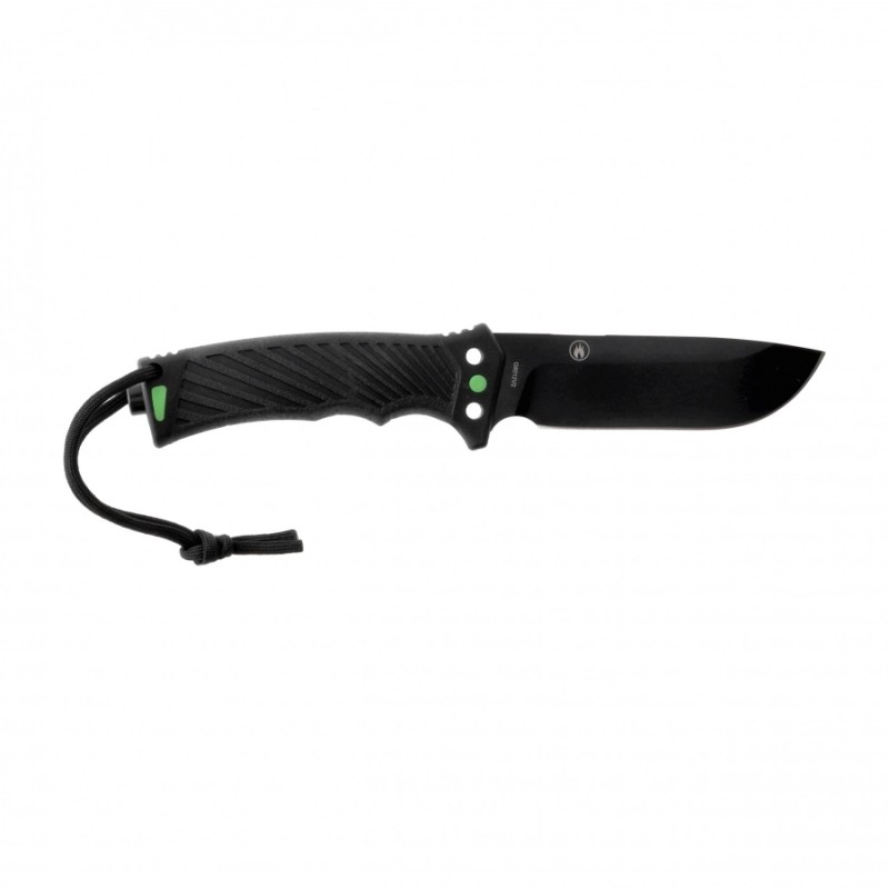 GANZO G8012V2-BK ma szeroką i masywną głownię o długość 113 mm, wykonaną ze stali nierdzewnej 8CR13 57-58 HRC, która stanowi wprost idealny wybór w przypadku noża outdoorowego. Zastosowana stal jest odporna na korozję i zużycie, dosyć długo zachowuje ostrość oraz łatwo się ostrzy, co w przypadku noża survivalowego ma ogromne znacznie. Twarda stal o grubości 5 mm daje wyraźnie do zrozumienia, że nóż został stworzony do pracy w terenie i może być wykorzystywany do rąbania i batonowania. Grzbiet noża ma płaski frez o ostrych krawędziach, który doskonale współpracuje z krzesiwem i ułatwia krzesanie iskier.