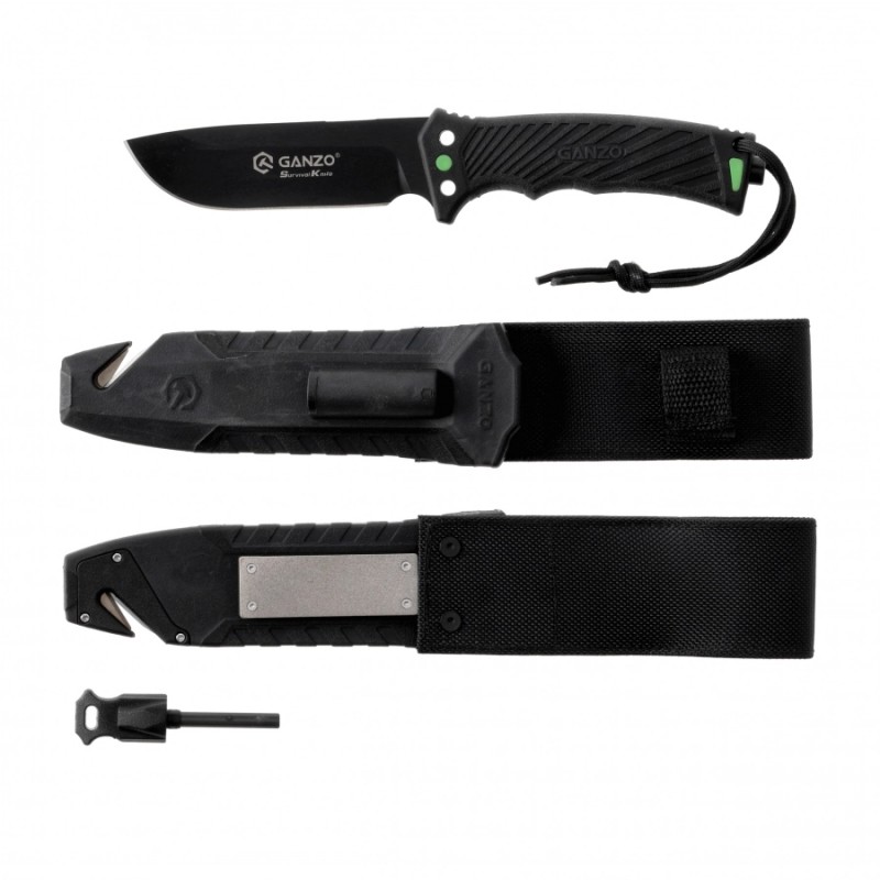 Ganzo Firebird G8012V2-BK to solidny nóż survivalowy o stałej klindze wykonany ze stali nierdzewnej 8Cr13Mov. W zestawie polimerowa pochewka wyposażona w dodatkowe ostrze do cięcia linki, osełkę diamentową oraz kompaktowe krzesiwo.