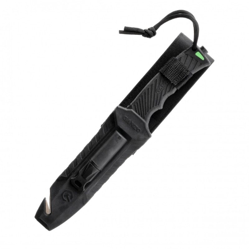 Do noża Ganzo Firebird G8012V2-BK dołączono wielofunkcyjną pochewkę, która nie tylko na bezpieczne przenoszenia noża, ale ma również szereg ważnych narzędzi survivalowych. Pochewkę wykonano z tworzywa sztucznego oraz tkaniny nylonowej, odpornej na wilgoć, pleśń i upływa czasu. Na zewnętrznej stronie umieszczono kompaktowe krzesiwo, za pomocą którego, już po krótkim treningu bez trudu rozpalimy ogień. Na wewnętrznej stronie zamontowano małą ostrzałkę diamentową pozwalającą na ostrzenie noża w terenie. W dolnej części pochewki osadzono wyjmowane ostrze, które z łatwością radzi sobie z cięciem linki, żyłki oraz taśmy.
