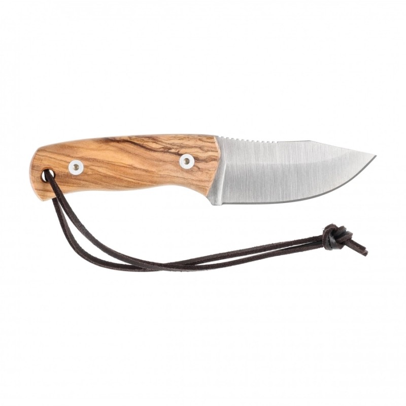 Masywne ostrze o długości 75 mm, poradzi sobie z większością prac terenowych bez obawy o jego uszkodzenie. Klasyczny charakter noża outdoorowego, podkreślają profilowane okładziny wykonane z drzewa oliwnego. W rękojeści wpleciono skórzany rzemień pełniący rolę smyczki na nadgarstek. Do przenoszenia noża na pasie służy tradycyjna skórzana pochewka.