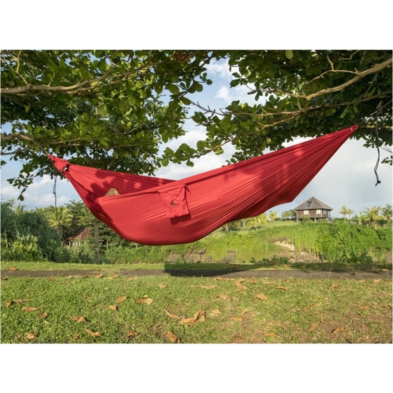Hamak Ticket To The Moon jednoosobowy czerwony to lekki hamak turystyczny wykonany z szybkoschnącej tkaniny nylonowej gwarantującej wytrzymałość oraz komfort wypoczynku.
