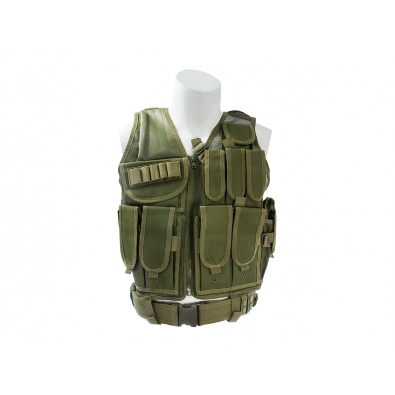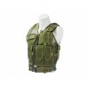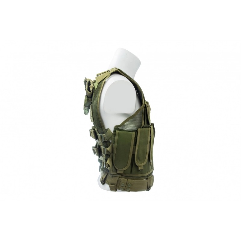 Dzięki podszyciom taśmy valcro jesteśmy w stanie dopasować układ ładownic, kieszeni pod własne potrzeby. Uniwersalna kabura w kamizelce będzie pasowała do większości pistoletów. Tył kamizelki został wykonany w systemie molle dzięki czemu możemy dopiąć dodatkowy ekwipunek. Kamizelka dostępna w kolorze oliwkowym.