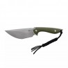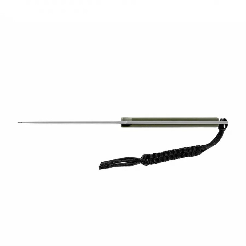 Rękojeść Civivi Elementum wykonano z zabarwionego na zielono tworzywa G10. Ten kompozyt, wykonany z włókna szklanego i syntetycznej żywicy jest lekki i niepodatny na uszkodzenia mechaniczne. Chropowata faktura okładzin sprawia, że nóż dobrze leży nawet w spoconej dłoni. Niewielki jelec zabezpiecza dłoń przed ześlizgnięciem się na ostrze. Rękojeść wieńczy otwór, przez który przechodzi linka z paracordu.