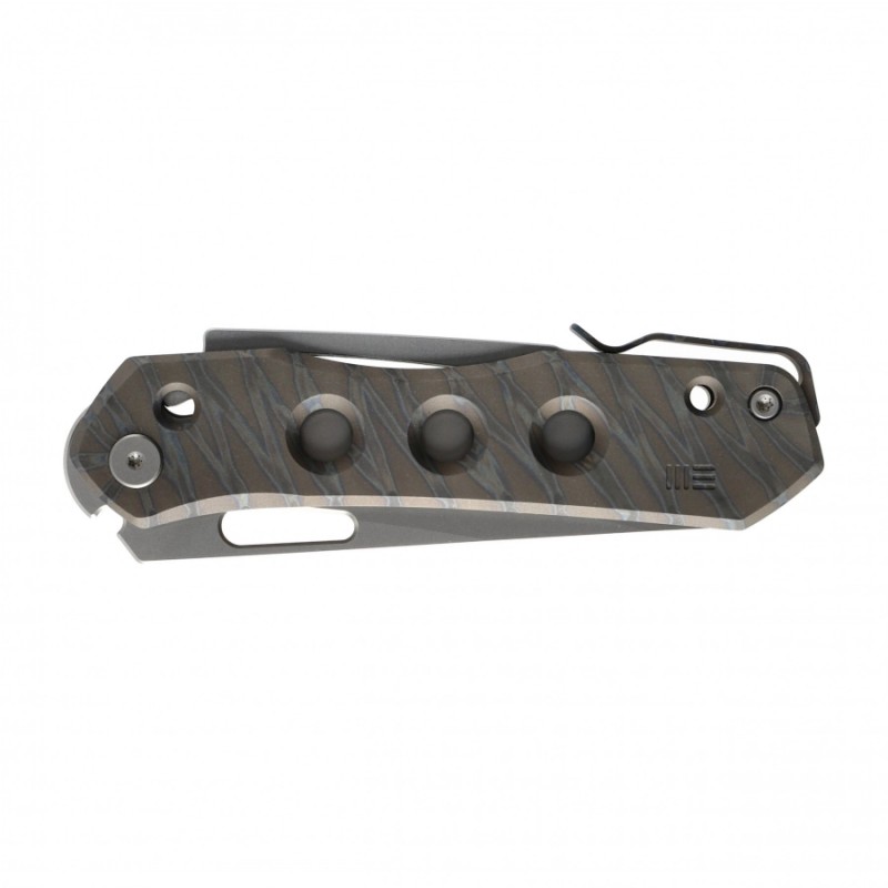 Głownię WE Vision R wykuto ze stali CPM-20CV, doskonale trzymającej krawędź i odpornej na korozję. Klingę typu Reverse Tanto, zahartowaną do 59-61 HRC i wykończoną metodą Bead Blast, otwiera się za pomocą otworu w głowni lub grawitacyjnie. Rękojeść wykonano z tytanu pomalowanego w charakterystyczny wzór – pamiętający wojnę w Wietnamie kamuflaż Tiger Stripe. Całość blokuje nowatorski mechanizm Superlock.
