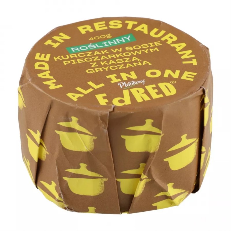 Konserwa Ed Red o smaku roślinnego kurczaka w sosie pieczarkowym z kaszą gryczaną z serii ALL IN ONE to pyszne danie przygotowane wyłącznie z naturalnych składników, umieszczone w ekologicznym opakowaniu z długim terminem przydatności do spożycia.