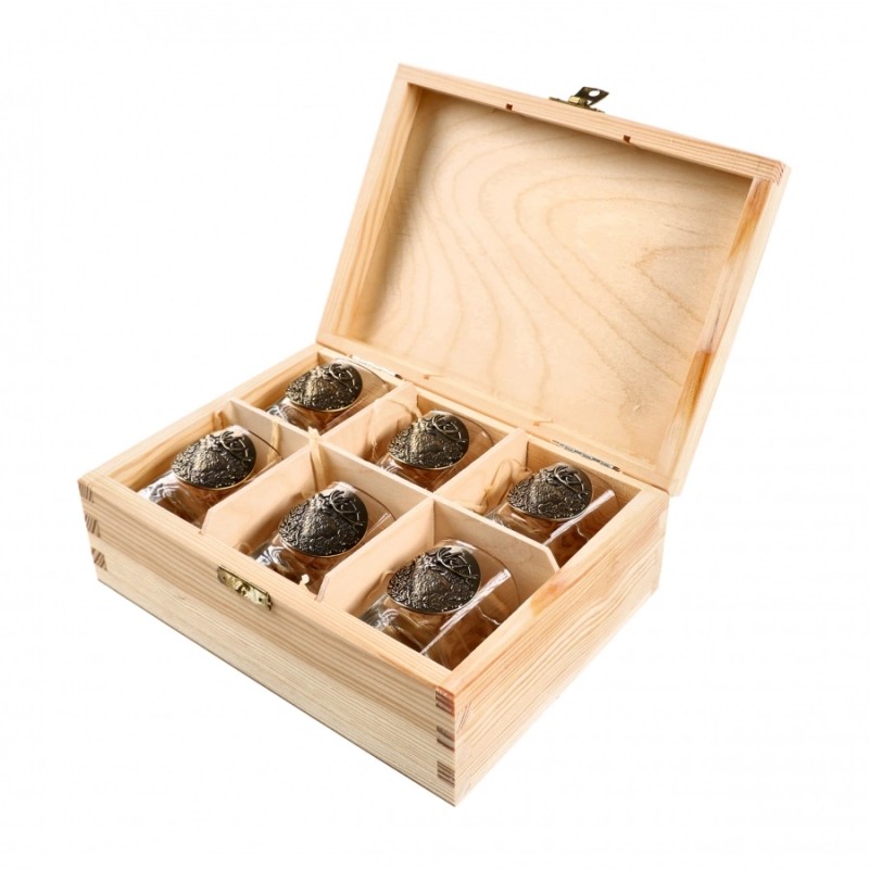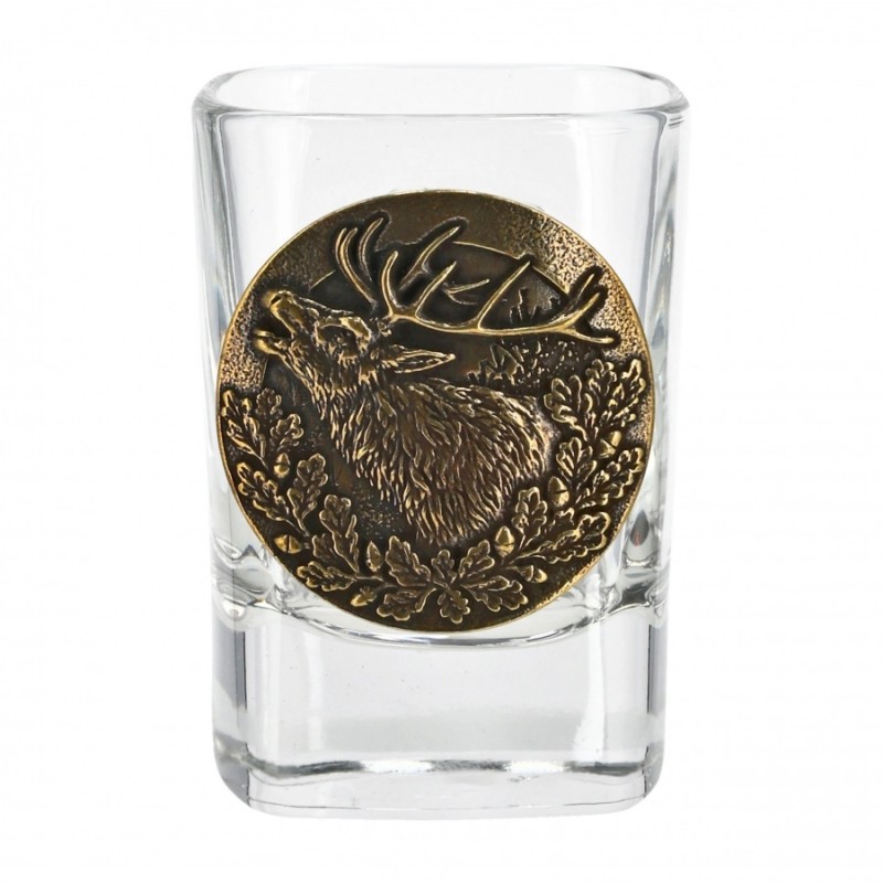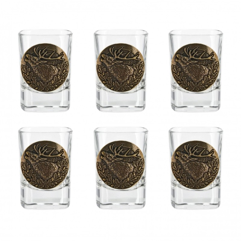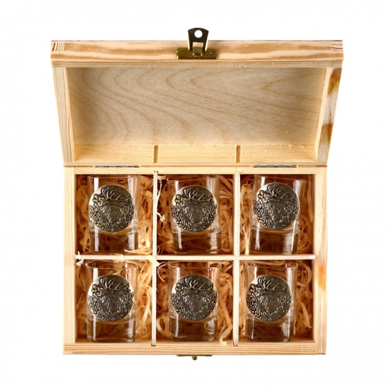 Kieliszki o pojemności 45 ml wykonano ze szkła wysokiej klasy. Kieliszki umieszczono w drewnianym pudełku o estetycznym wyglądzie. Pudełko wypełnione zostało wełną drzewną, będącą naturalnym materiałem wielokrotnego użytku. Każdy kieliszek zdobiony jest mosiężną plakietką z odlewem przedstawiającym ryczącego jelenia. Na wieku pudełka widnieje ozdobny grawer.