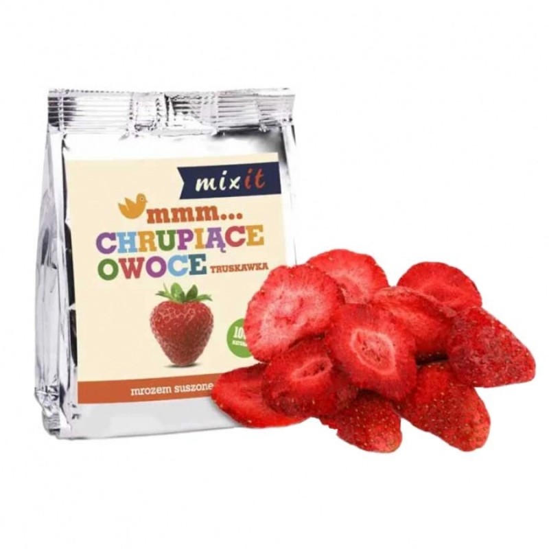 Specjaliści od zdrowej żywności tym razem poddali próbie uwielbiane przez wszystkich truskawki. Owoce suszone mrozem okazału się strzałem w dziesiątkę. Owocowa przekąska Mixit jest idealnie krucha i co ciekawe, nie trzeba jej nawet przechowywać w lodówce (przed otwarciem). Lliofilizowane owoce Mixit pakowane do szczelnej saszetki strunowej, dlatego można je wygodnie chrupać pracy, w szkole oraz podczas wycieczki.