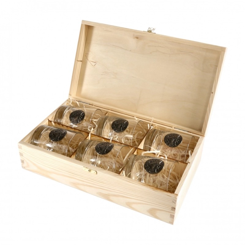 Komplet składa się z sześciu szklanek ozdobionych mosiężnymi tabliczkami z wizerunkiem byka. Zestaw ekskluzywnych szklanek pakowanych w drewniane pudełko to wyjątkowy prezent dla leśnika, myśliwego oraz każdego dorosłego pasjonata kultury łowieckiej.