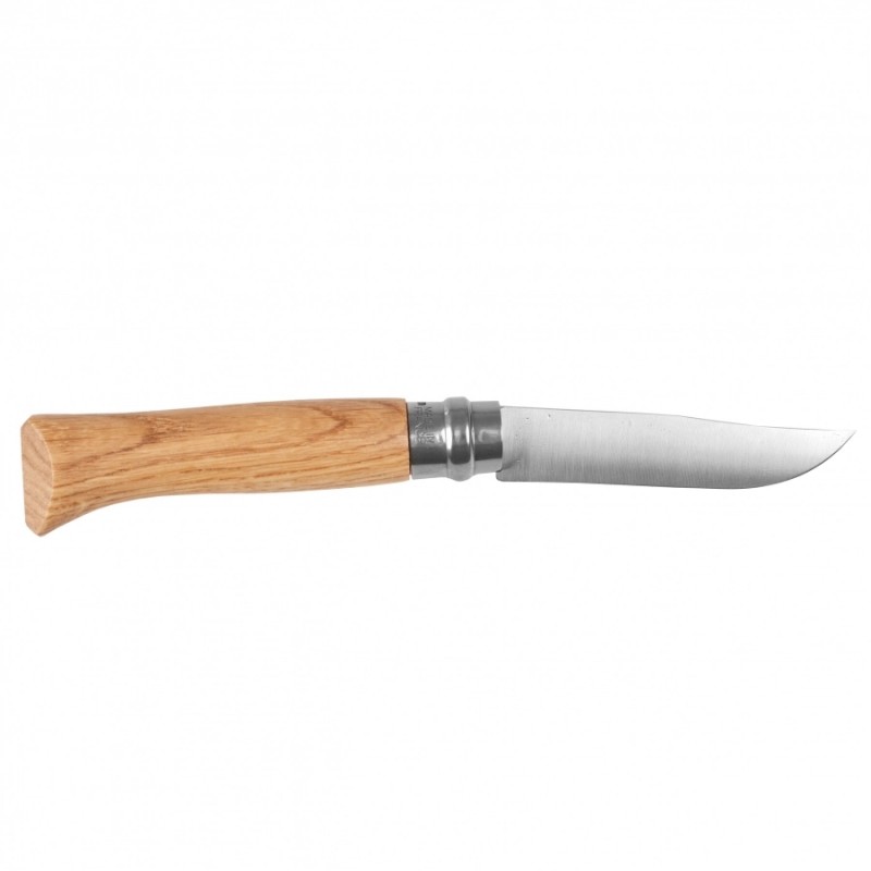 Opinel 8 inox dąb jeleń to składany nóż outdoorowy z blokowaną głownią ze stali Sandvik 12C27 oraz rękojeścią z drewna dębowego.
