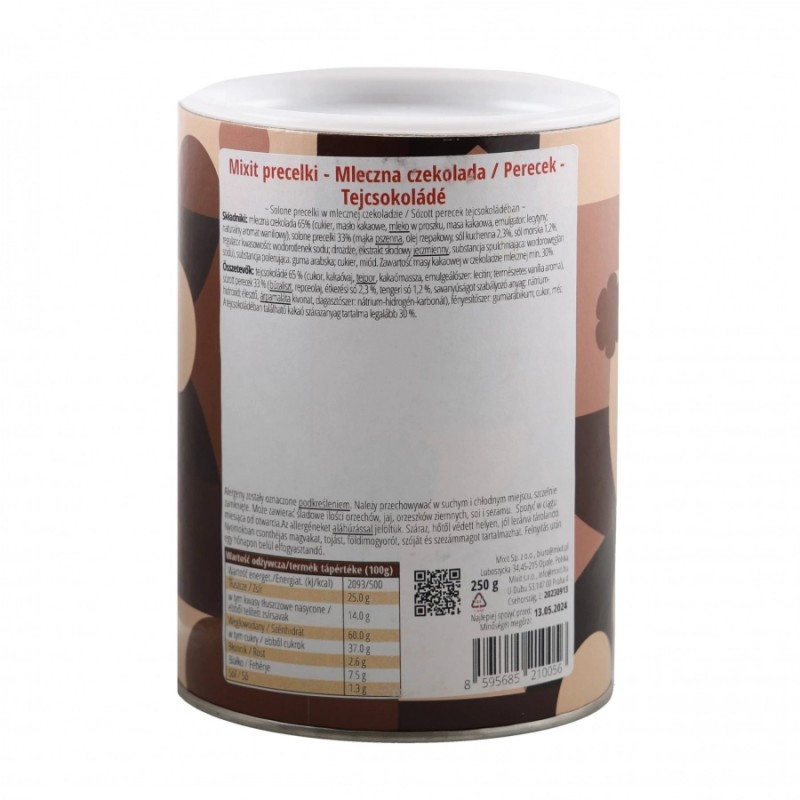 Każdy precelek Mixit pokryty jest delikatną mleczną czekoladą, dzięki czemu jest idealnym połączeniem słodkiego i słonego smaku.
