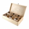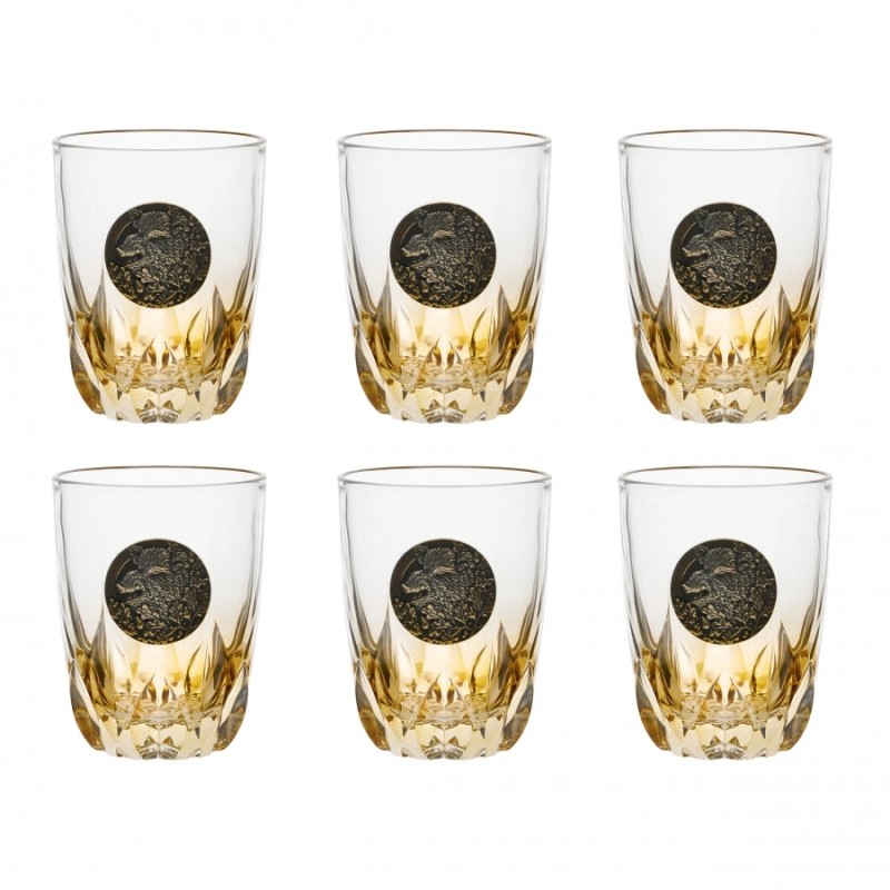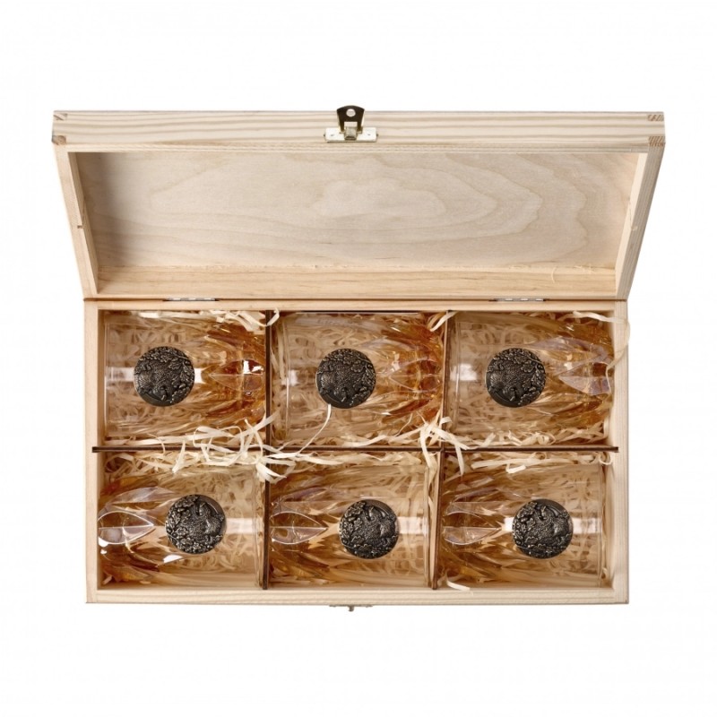 Komplet składa się z 6 wydłużonych szklanek z barwienien natryskowym w kolorze bursztynu, które dodatkowo ozdobiono mosiężnymi tabliczkami z wizerunkiem samca dzika. Tak skomponowany zestaw ekskluzywnych szklanek pakowany jest w drewniane pudełko. Będzie to znakomity prezent dla leśnika, myśliwego oraz każdego dorosłego zwolennika mocniejszych trunków.