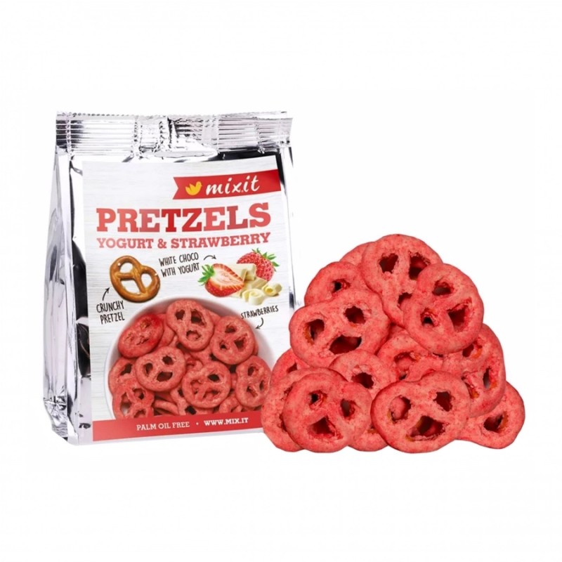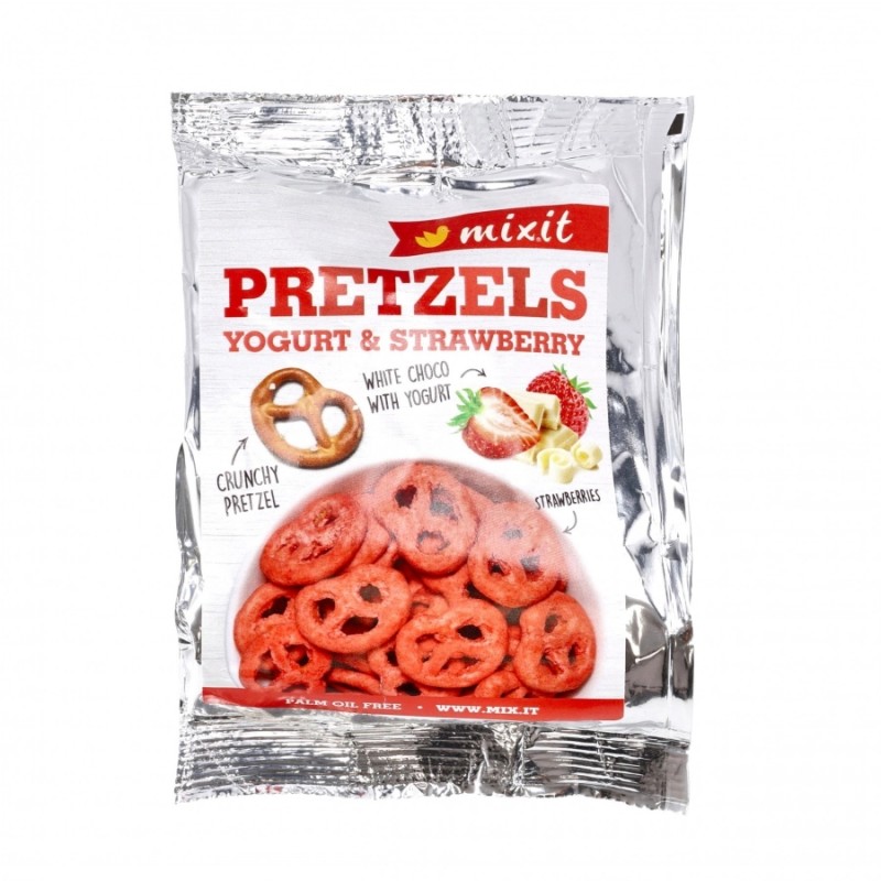 Połączenie truskawek, jogurtu i czekolady przywołuje wspomnienia lodów truskawkowych, a chrupiący precelek dodaje wyjątkowego smaku. Precle Mixit są nie tylko smaczne, ale i praktyczne – bez trudu zmieszczą się w kieszeni.
