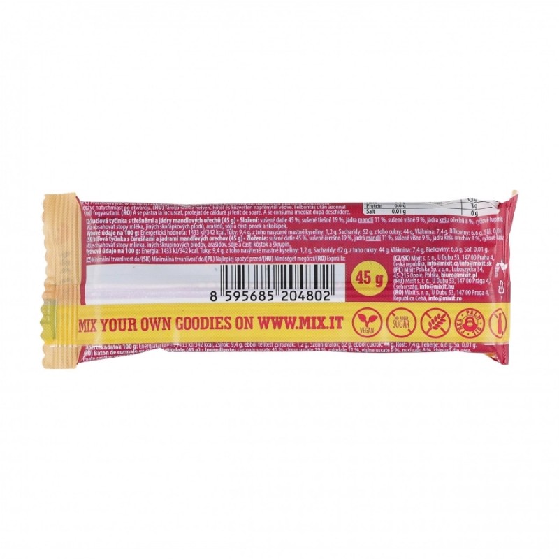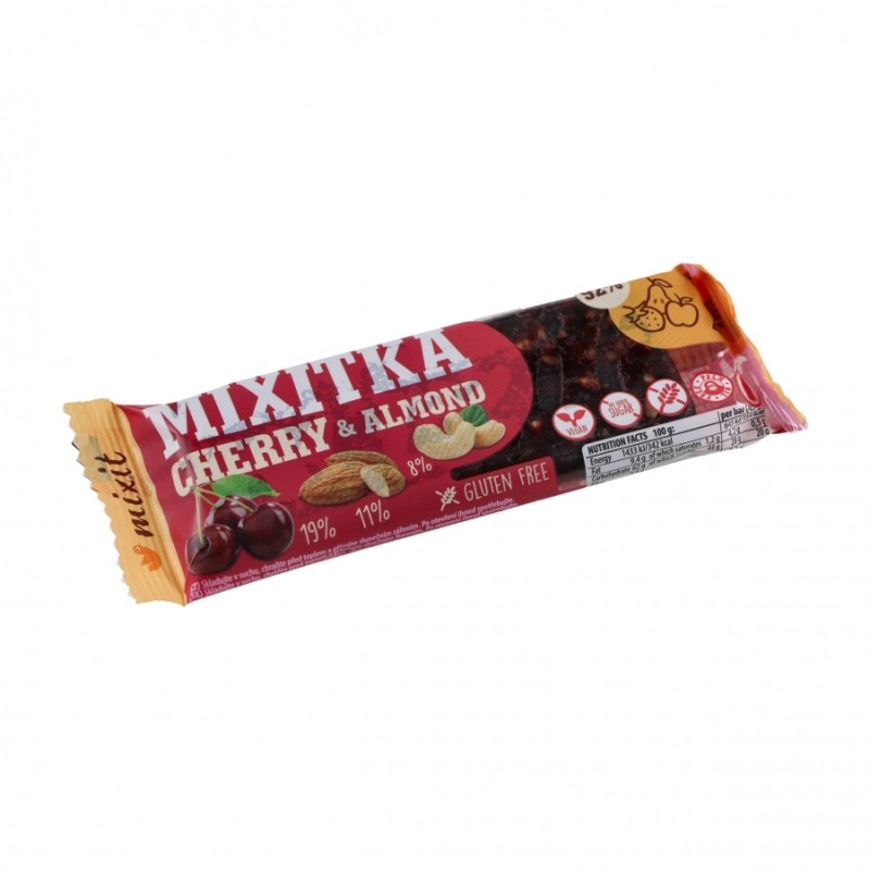 Mixitka o smaku owoców czereśniowych z dodatkiem orzechów, to słodycz będąca znakomitą alternatywą dla tradycyjnego batona czekoladowego. Produkt nie zawiera dodatku cukru, jedynie fruktozę, która naturalnie zawarta jest w owocach. Wyjątkowa jakość składników zapewnia wyrazisty smak. Dodatek czereśni dodaje przyjemnego aromatu i słodkości. Z kolei migdały zapewniają wartości odżywcze. Przekąska zapakowana jest w foliowe, półprzezroczyste opakowanie z łatwym otwarciem. Waga to 45 gramów.