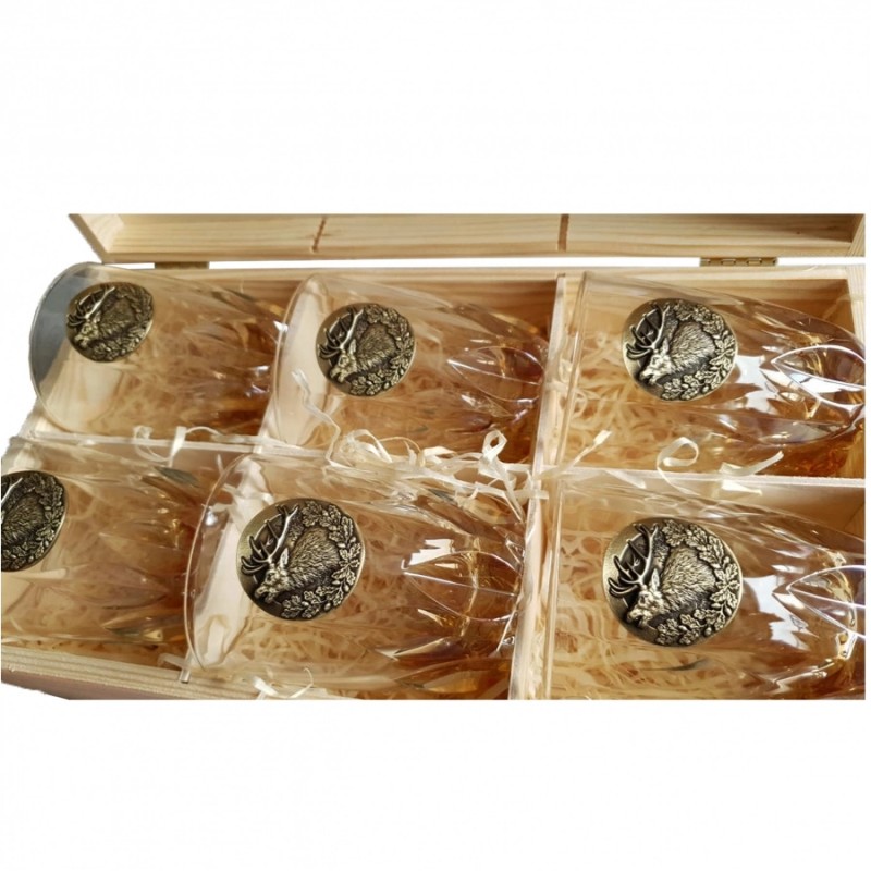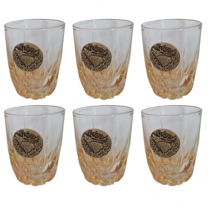 Komplet składa się z sześciu szklanek o owalnej podstawie, zdobione mosiężnymi medalionami z wizerunkiem ryczącego jelenia oraz bursztynowym natryskiem naniesionym na spód szklanki. Bursztynowe zdobienie wspaniale podkreśla głębię barwy whisky.