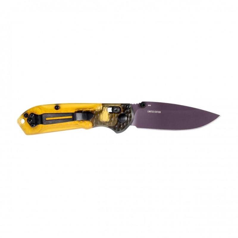 Benchmade 565PL-2501 Mini Freek to nóż składany w wersji premium, wyposażony w głownię ze stali CPM M4, elegancką półprzezroczystą rękojeść wykonaną z tworzywa Ultem w kolorze żółtym.