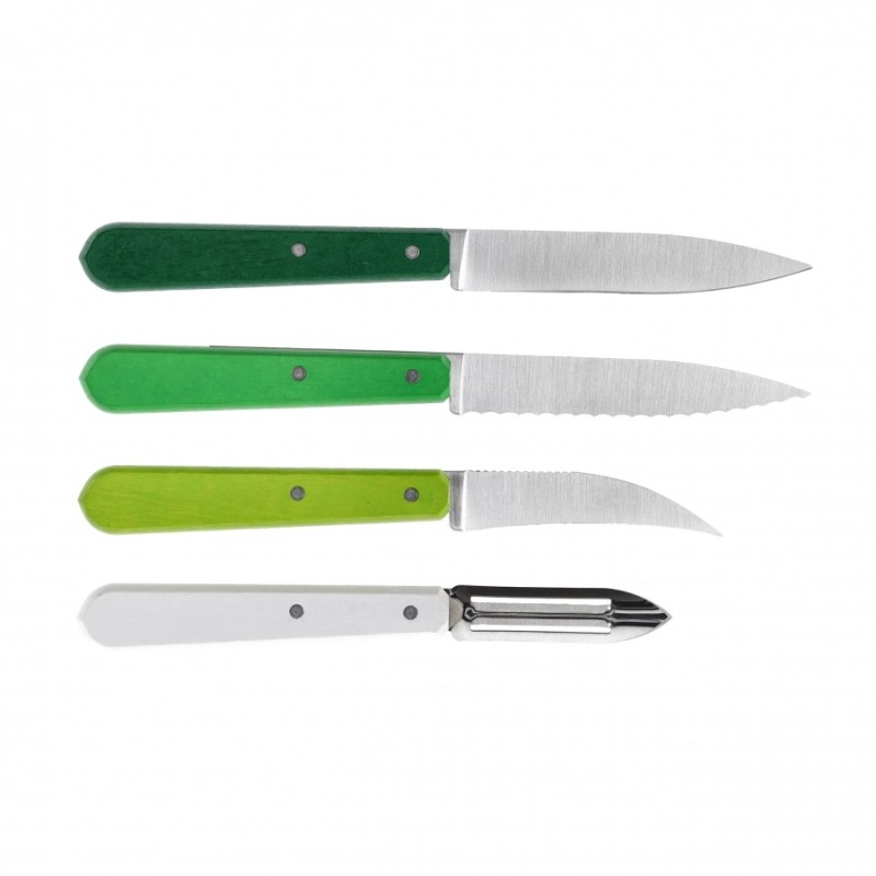 Opinel Essentials Primavera zawiera 4 potrzebne w kuchni narzędzia: nóż do warzyw Opinel 112, nóż do warzyw Opinel 113, zakrzywiony nóż do warzyw Opinel 114 i uniwersalną obieraczkę Opinel 115.
