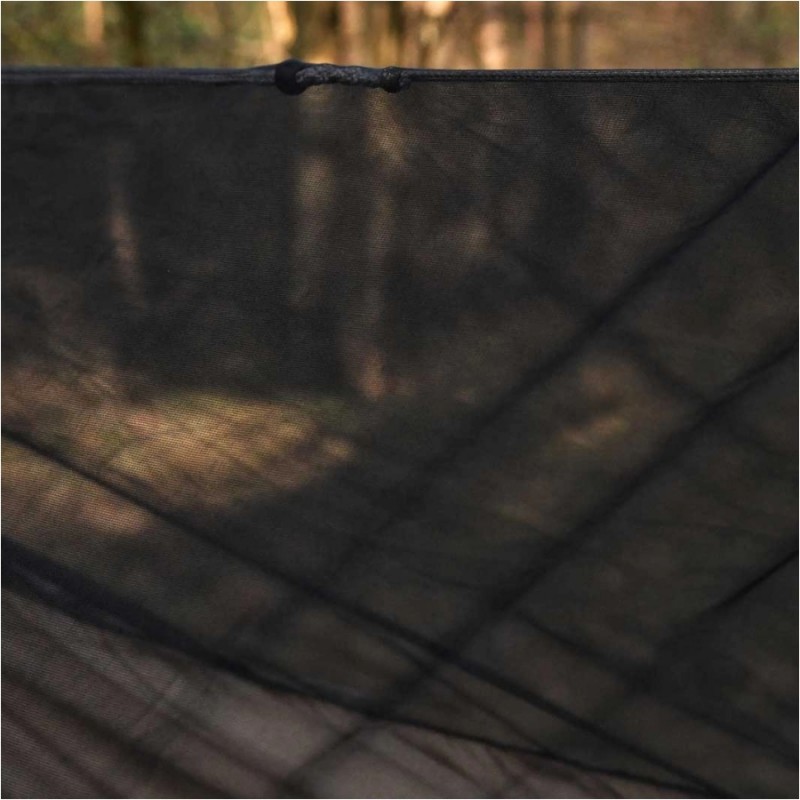Hamak TigerWood Ważka V2 wykorzystuje wzmocnioną siatką ripstop tkaninę nylonową, gwarantującą te same korzyści wsparte zwiększoną odpornością na uszkodzenia. Materiał charakteryzuje się wysoką odpornością na rozciąganie, dzięki czemu bez problemu utrzyma ciężar do 275 kg. Charakteryzuje się przy tym niską masą oraz dobrą oddychalnością, dzięki czemu będzie komfortowy zarówno w transporcie jak i podczas użytkowania. Umieszczona na boku hamaka kieszonka umożliwi przechowanie pod ręką kluczowych akcesoriów. Zintegrowana moskitiera została natomiast wyposażona w cięciwy, które pozwalają na jej odpowiednie napięcie dla komfortu użytkownika.
